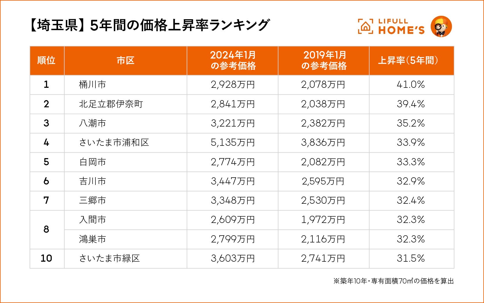 5年間の価格上昇率を、神奈川、埼玉、千葉の3県について見てみると、それぞれ三浦市(49.7%)、桶川市(41.0%)、印西市(48.8%)が1位となりました。いずれの県においても県庁所在地以外の市区が上位にランクインしており、東京都と同様に郊外への人の流れがあることがうかがえます。