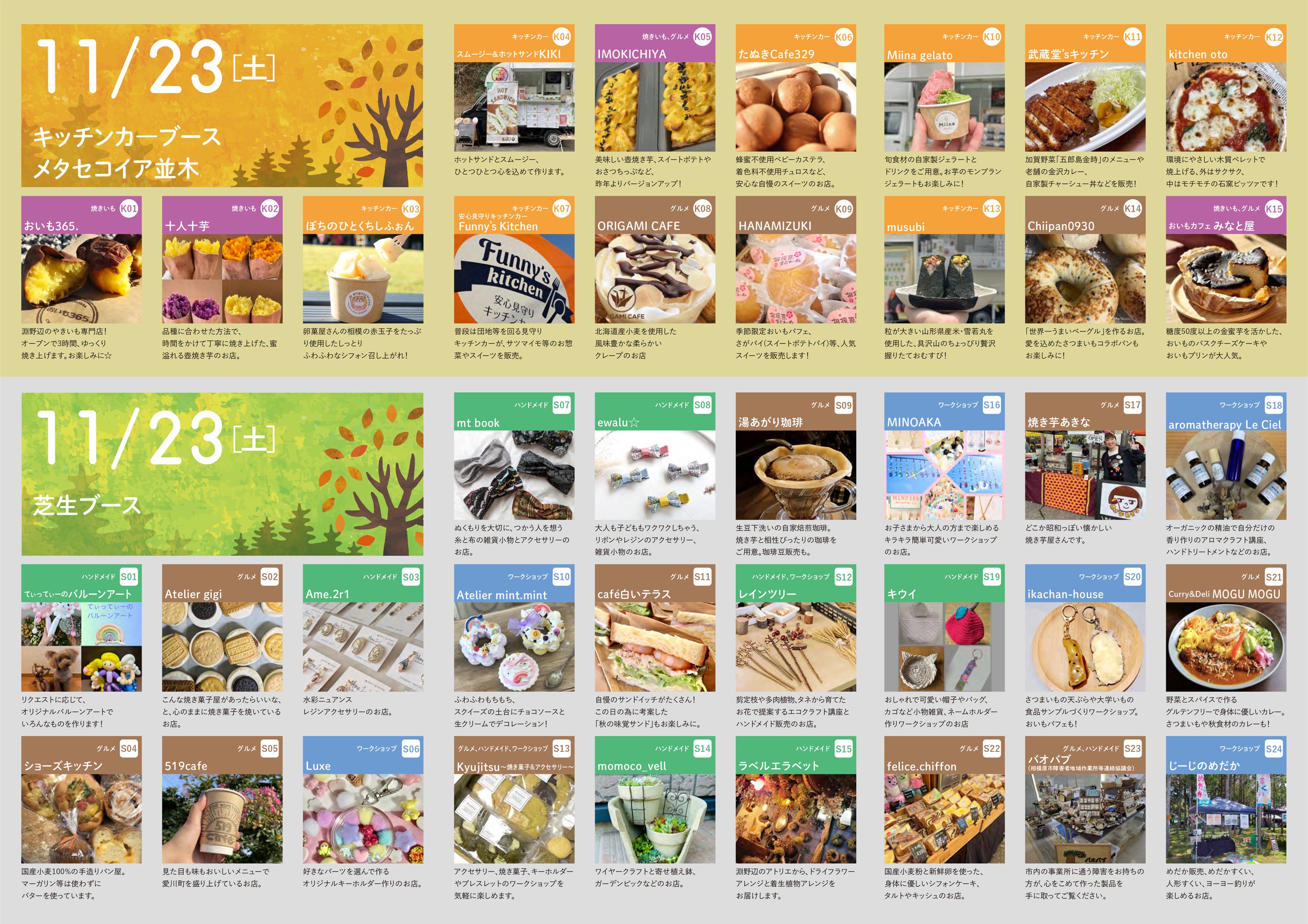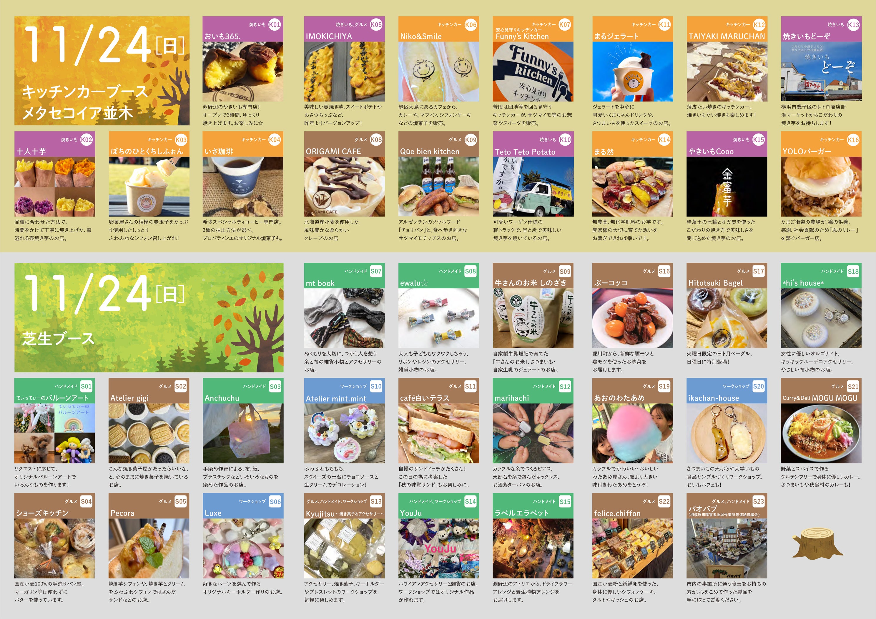 広々とした芝生ブースでは地元・相模原市のグルメをとりそろえたキッチンカーや、秋にぴったりの焼きいも、地域で活躍する作家の方々のハンドメイド作品販売やワークショップも実施。秋の公園を満喫できるマルシェ会場です!