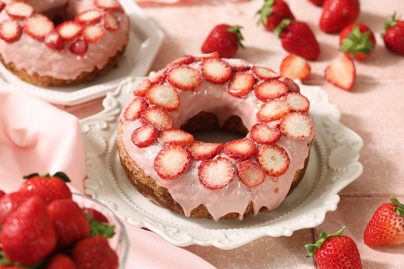 いちご風味のチョコリング生地の中には、いちごチョコレートとホワイトチョコレート入り。春らしくいちごチョコのコーティングを加え、チョコリングから溢れる限界までフレッシュないちごを飾った”よくばり”のネーミングにもふさわしい「いちごづくし」なチョコリングに仕上げました。