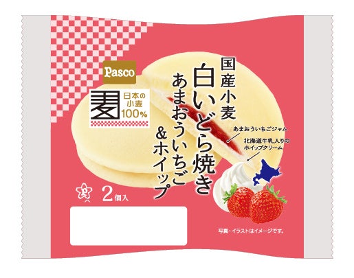 国産小麦の小麦粉を100%使用した生地で、あまおういちごジャムと北海道牛乳入りのホイップクリームを挟んだどら焼きです。冬に人気の高まるいちごの甘酸っぱい味わいと、なめらかでコクのあるホイップクリーム、そしてもちもち食感の白いどら焼き生地との組み合わせをお楽しみください。