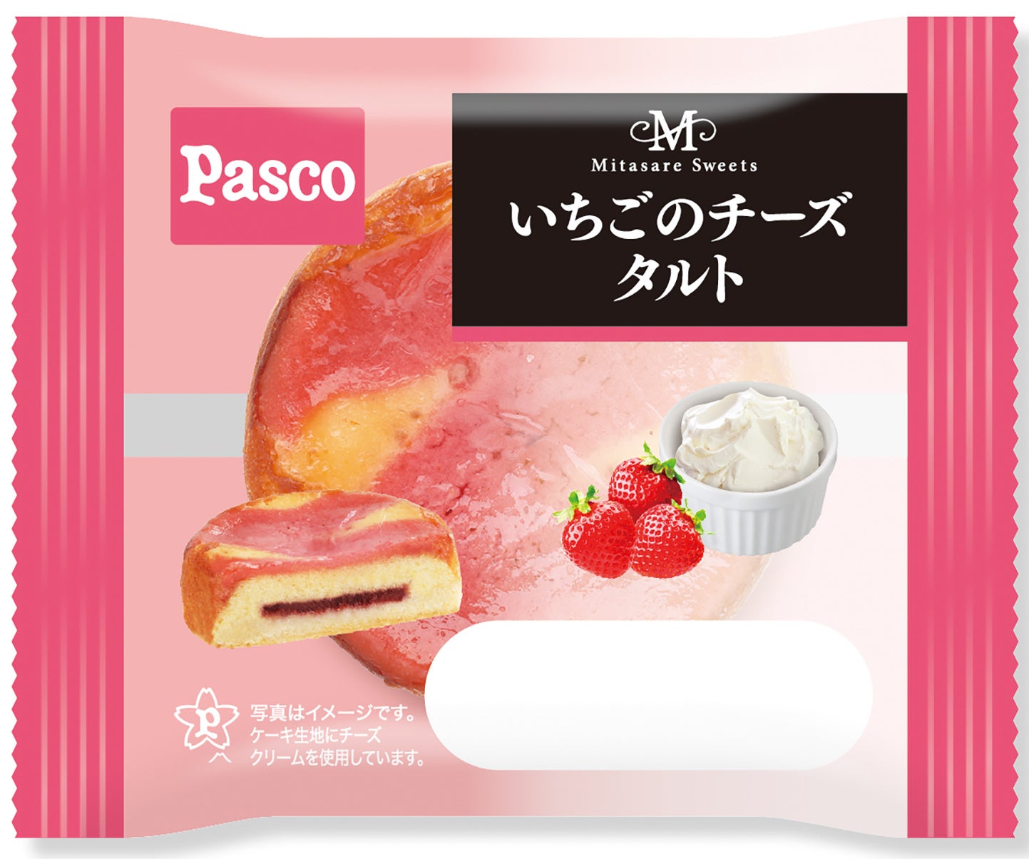 タルト生地にいちごジャム、加糖いちごピューレ入りのチーズケーキ生地をのせ、いちごをイメージしたピンク色の生地を線掛けして焼き上げました。