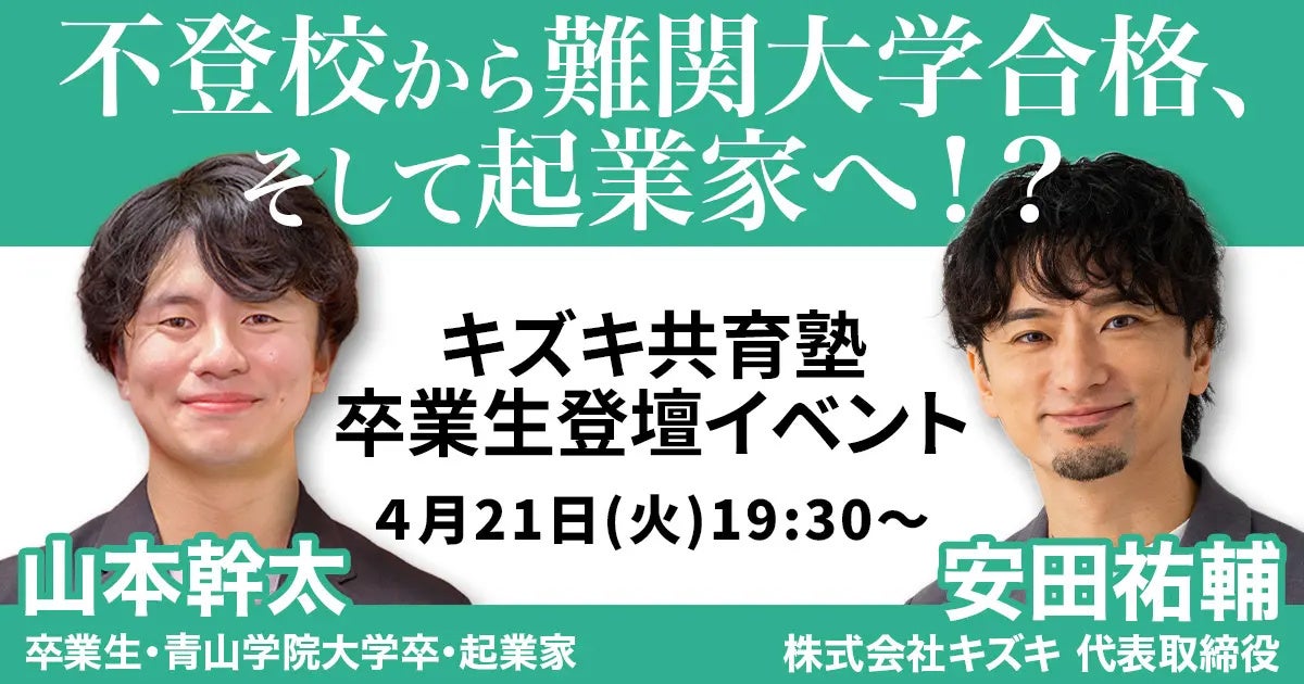 不登校、発達障害、勉強ブランクからの受験サポート15年、卒業生1万4000人超の「キズキ共育塾」が、YouTube再始動を記念し、かつての教え子とキズキ代表・安田による特別対談イベントを開催します。