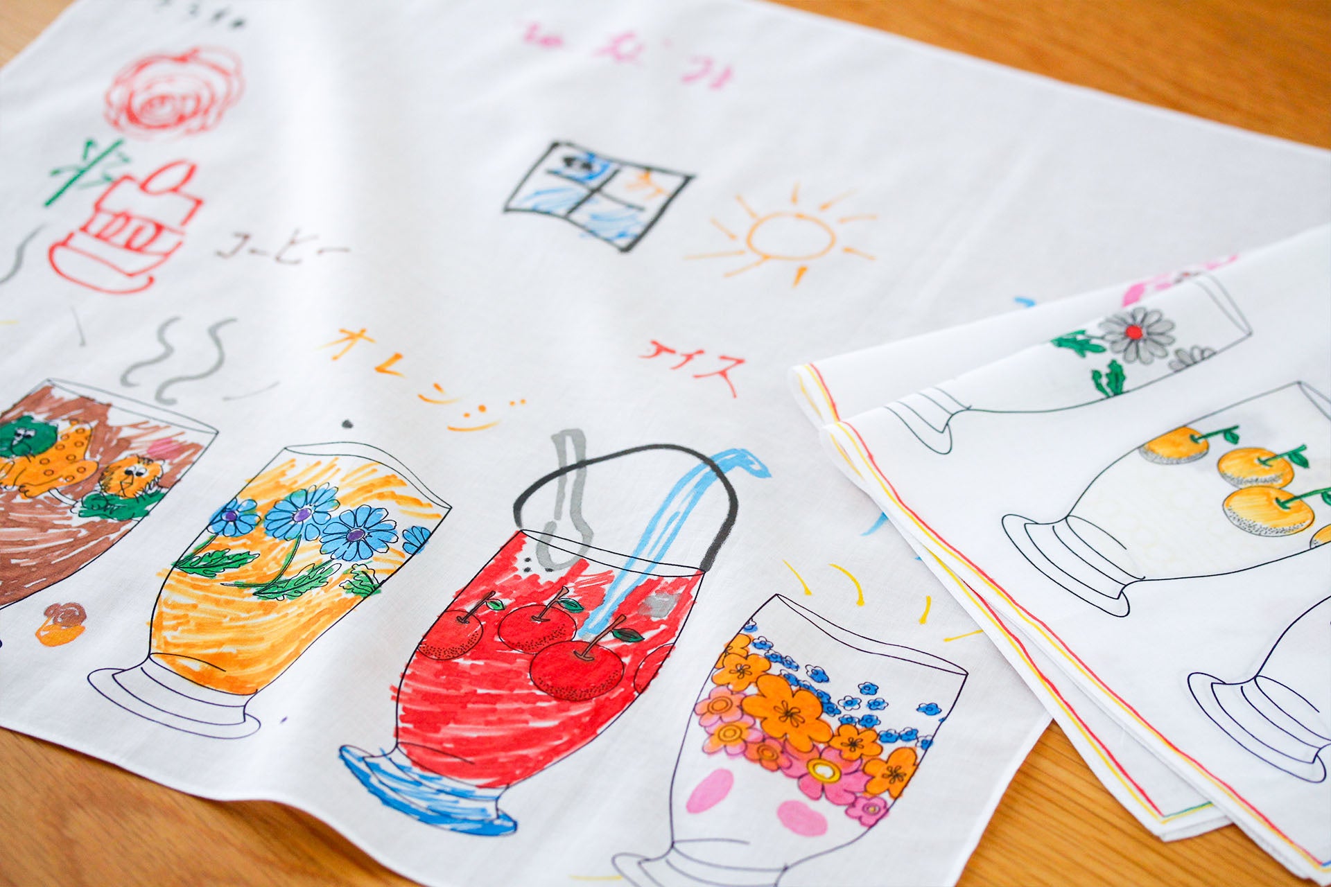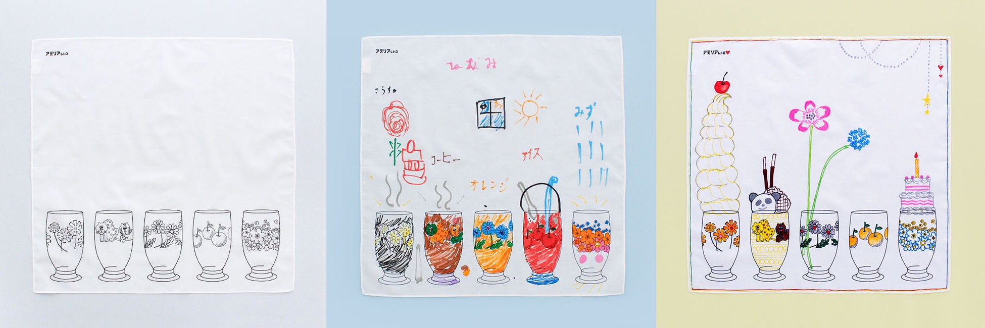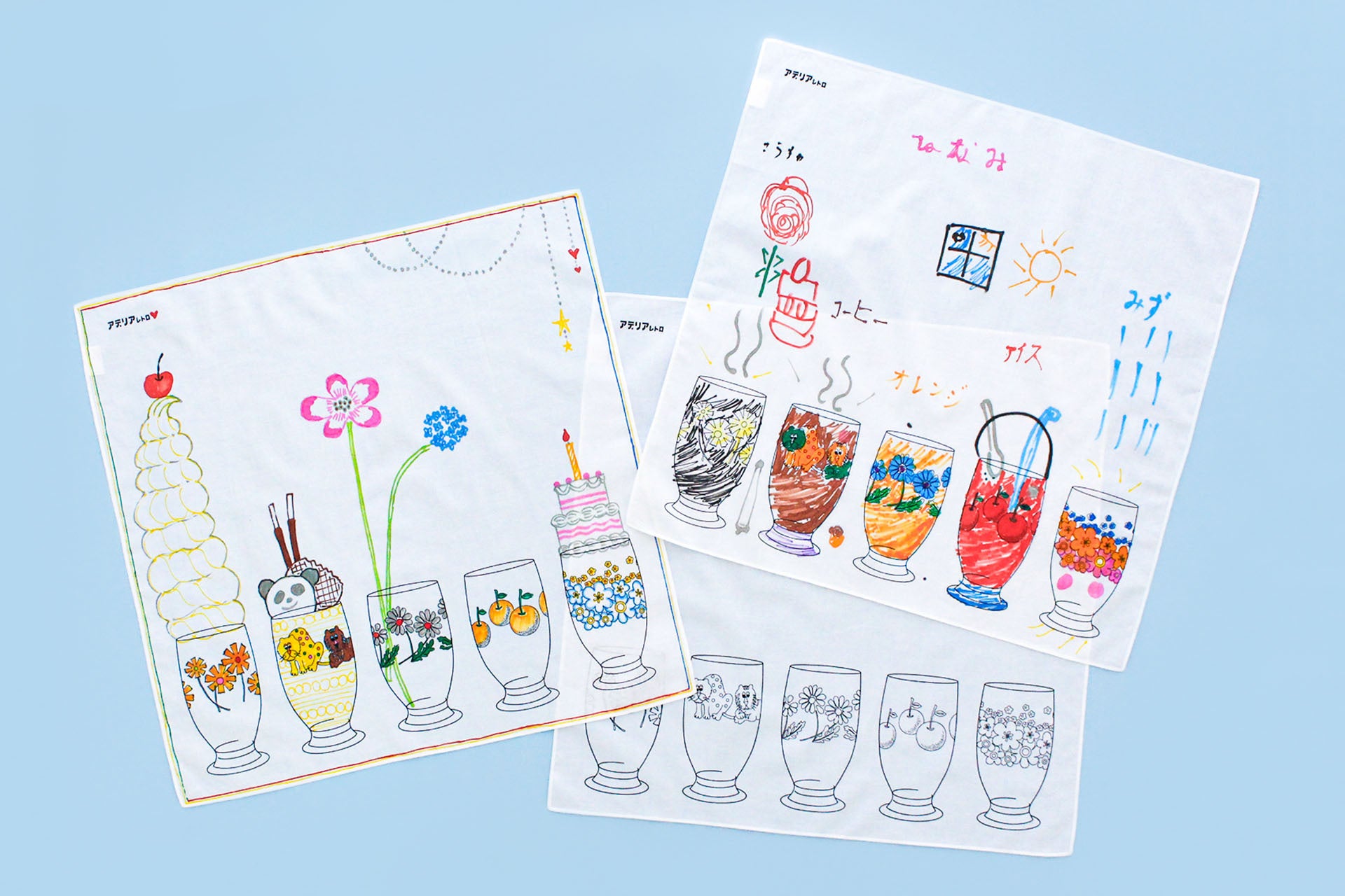 レトロで可愛らしい5つのグラスが描かれたオリジナルハンカチーフに、色を塗ったり絵を描き加えたり。世界にひとつだけの自分だけのハンカチーフをお作りいただけます。