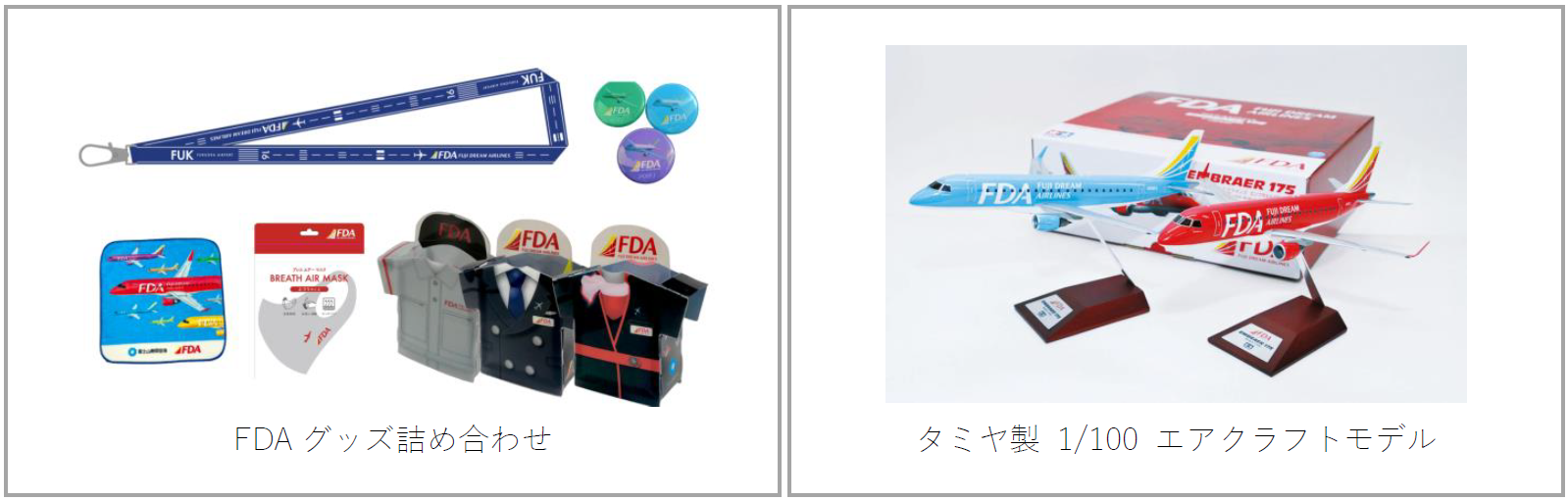 今回のコラボツアーでは、ご参加いただいたお客さま全員に「FDAグッズ詰め合わせ」をプレゼントするほか、ご乗車されたお客さまの中から毎便抽選で「タミヤ製1/100エアクラフトモデル」が当たります。さらに、乗車後のアンケートにご回答いただいた方の中から抽選で10名様にFDAの往復航空券をプレゼントします。
