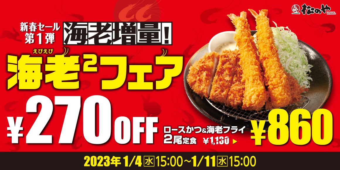 プリップリの海老の食感が楽しめる松のや自慢の海老フライが、1尾無料に!松のや王道人気のロースかつが乗った食べ応え満点「ロースかつ&海老フライ2尾定食」をご注文のお客様に限り、1週間限定で270円引きにてご提供いたします。さらに、12月に登場したジューシーで旨味たっぷり「上ロースかつ」との盛合せ「上ロースかつ&海老フライ2尾定食」も270円引きに!何もつけずに食べてもよし。松のや特製香草入りタルタルソースをたっぷり絡めて食べてもよし。お子様から大人までみんな大好きな海老フライ。新しい年の始まりは、縁起の良い海老で!「海老²フェア」は2023年1月11日(水)まで。この機会をお見逃しなく。