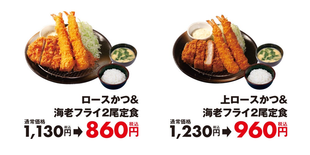 | 商品名 ロースかつ&海老フライ2尾定食 1,130円 → 860円 上ロースかつ&海老フライ2尾定食 1,230円 → 960円 ※全て税込価格です。また、店内・お持ち帰りの税込価格は同一です。 ※お持ち帰りいただけます。お持ち帰りのみそ汁は、別途60円でお買い求めいただけます。 ※本キャンペーン期間中の「ロースかつ&海老フライx1本定食」の販売はいたしません。 ※「上ロースかつ&海老フライ2尾定食」は沖縄店舗、松屋併設店舗では導入しません。 フェア期間 2023年1月4日(水)午後3時~2023年1月11日(水)午後3時 対象店舗 一部店舗を除く全国の松のや・松乃家 ※高速PA店舗を除く。 |