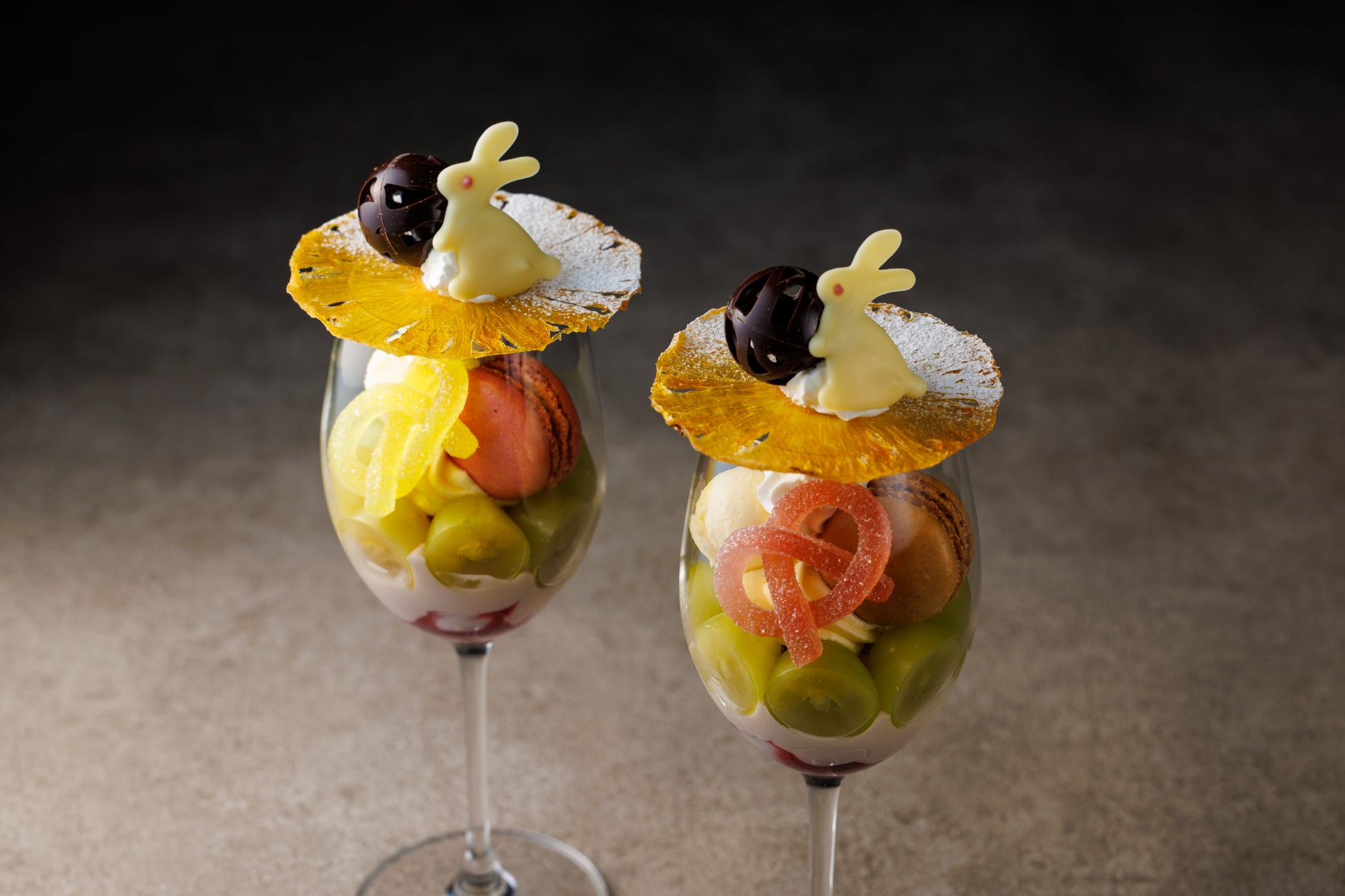 人と人とを結びつけるという意味がある水引を模したパート・ド・フリュイ(*1)や縁結びの神様、白うさぎ(*2)型のホワイトチョコレートを使用したホテル特製「開運パフェ」を提供します。パート・ド・フリュイの柔らかな食感や、金運と幸運のシンボルと言われるパイナップルのドライフルーツの爽やかな酸味がアクセントとなり、最後まで味わいの変化を楽しめるスイーツです。彩り鮮やかな盛り付け、白うさぎのチョコレートのトッピングなど、見た目にも会話が弾む一品です。