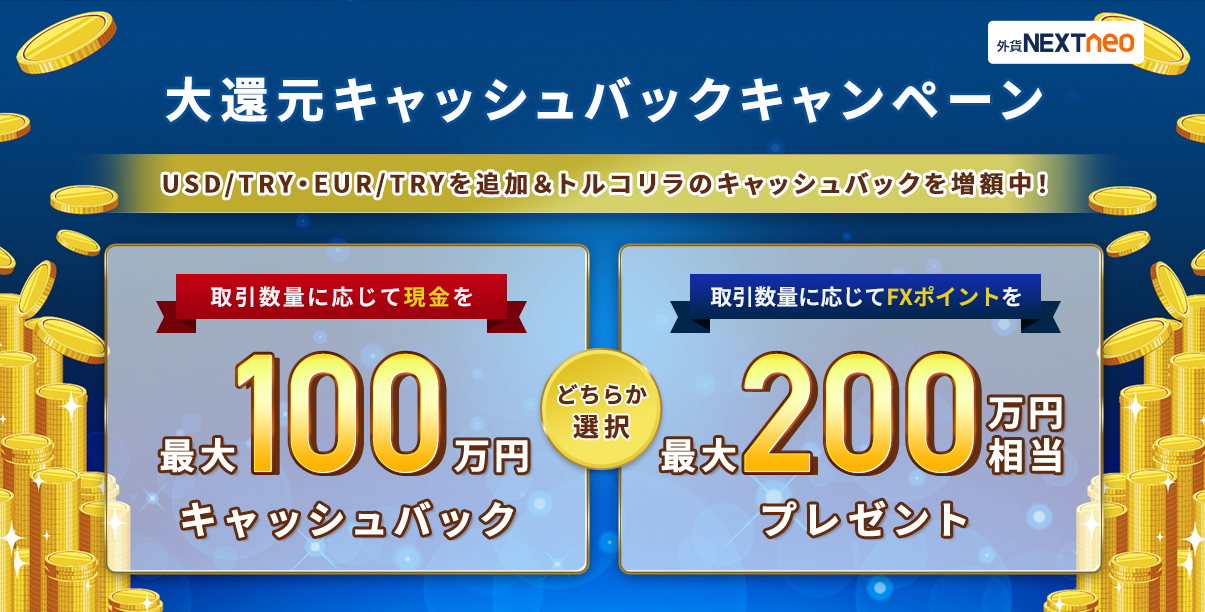 対象期間中の『外貨ネクストネオ』における指定通貨ペアの新規注文の取引量に応じて、最大200万円相当のFXポイント、もしくは現金100万円のキャッシュバックをいたします。