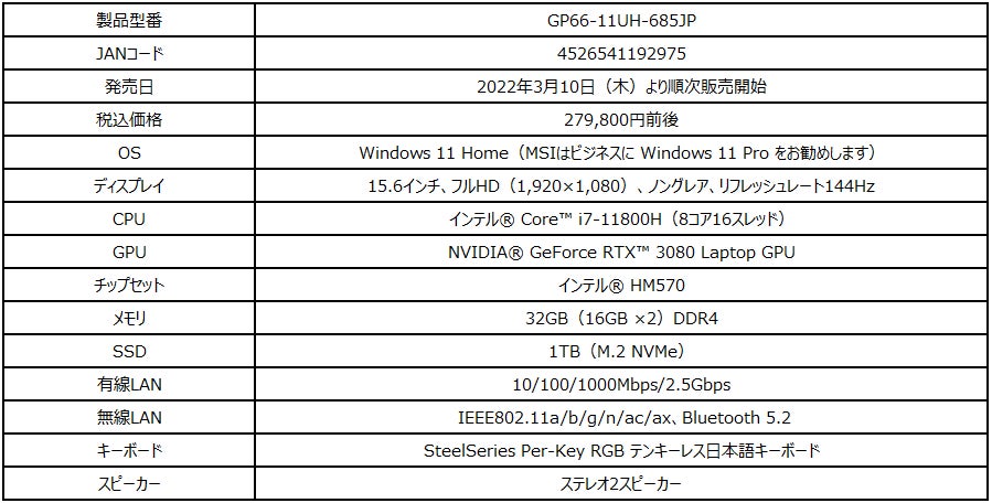 この度、エムエスアイコンピュータージャパン株式会社は、8コア16スレッドタイプのCPUとハイエンドグラフィックス機能「GeForce RTX™ 3080 Laptop GPU」に加え、メモリ32GB + SSD 1TBを搭載し税込価格28万円以下の高コストパフォーマンスを実現したハイエンドゲーミングノートPC「GP66-11UH-685JP」を2022年3月10日(木)よりMSI公式オンラインショップ(以下、MSIストア)限定で先行発売いたします。