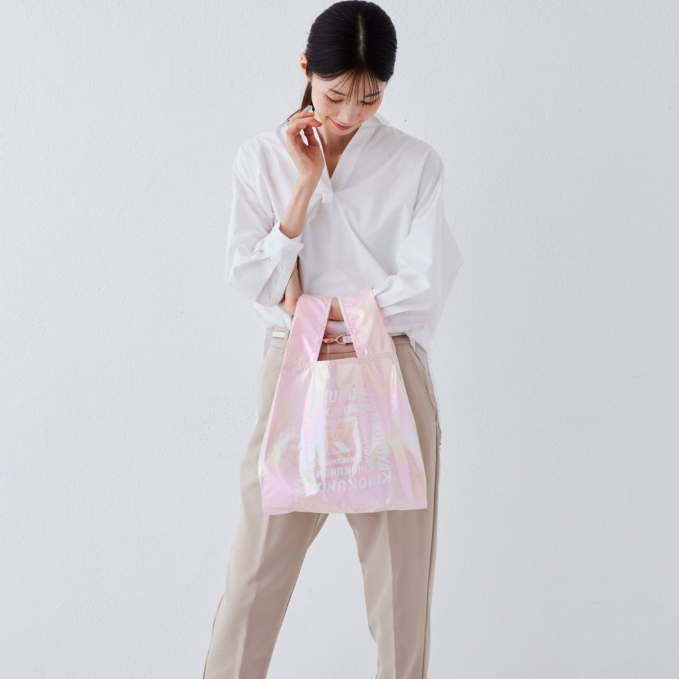 光の加減によってきらりと輝く、淡い色合いが魅力のエコバッグです。街中でも映える上品な光沢感が、日常の装いに華やかさを添えてくれます。