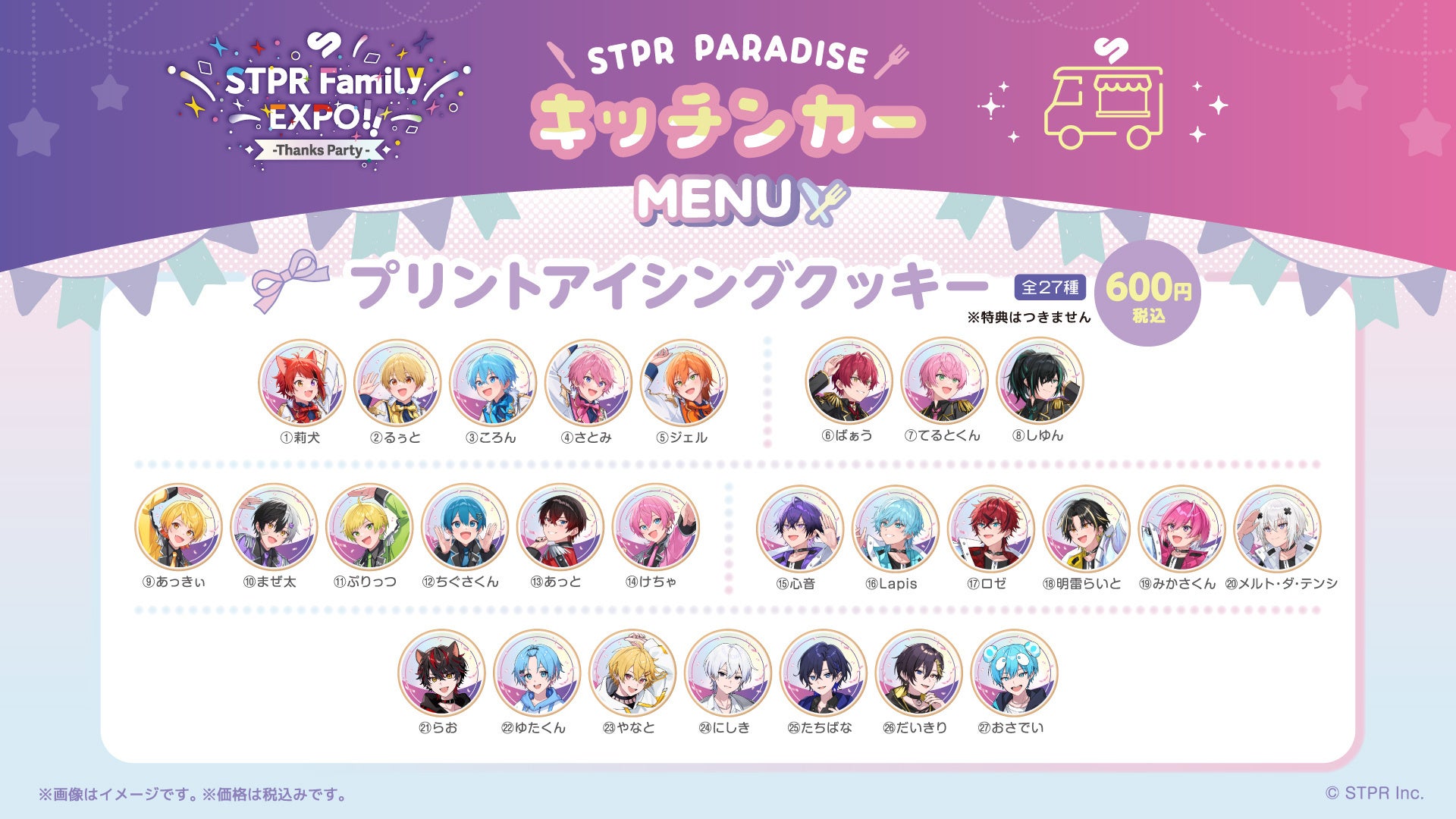 キッチンカーでは、グループロゴ入りのストロータグと推し色を組み合わせて楽しめる「STPR Family!!コラボドリンク」や、『STPR Family EXPO!! -Thanks Party-』のビジュアルを使用した27種の「プリントアイシングクッキー」など、見て・食べて楽しめるオリジナルメニューを展開。ハイタッチ会や握手会、展示といったリアルイベントとあわせて、「美味しい」&「楽しい」をお届けします。