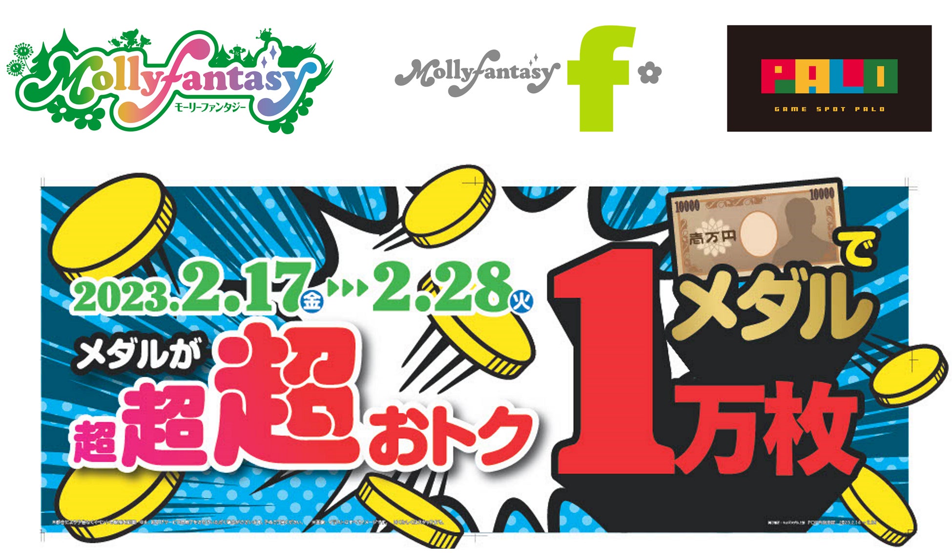 株式会社イオンファンタジー(本社:千葉県千葉市、代表取締役社長:藤原徳也、以下、当社)は、メダルコーナーご利用のお客さま向けに、「モーリーファンタジー」をはじめとするアミューズメント施設においてメダルイベント「1万円でメダル1万枚」を2月17日(金)より開催いたします。通常の貸出枚数よりも大変お得な枚数でお貸出しするイベントとなります。
