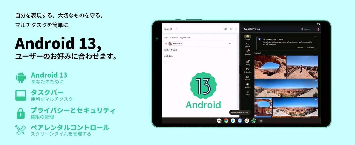 Android 13でこれまでにないパーソナライゼーションをご体験ください。カラー、テーマと言語を調整して、アプリとメディア プレーヤーを独自の好みにカスタマイズできます。セキュリティとプライバシーが最優先され、アプリのアクセス許可の制御を強化して、プライバシーを管理し、写真、ビデオ、クリップボードの履歴をより効果的に保護します。