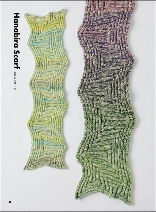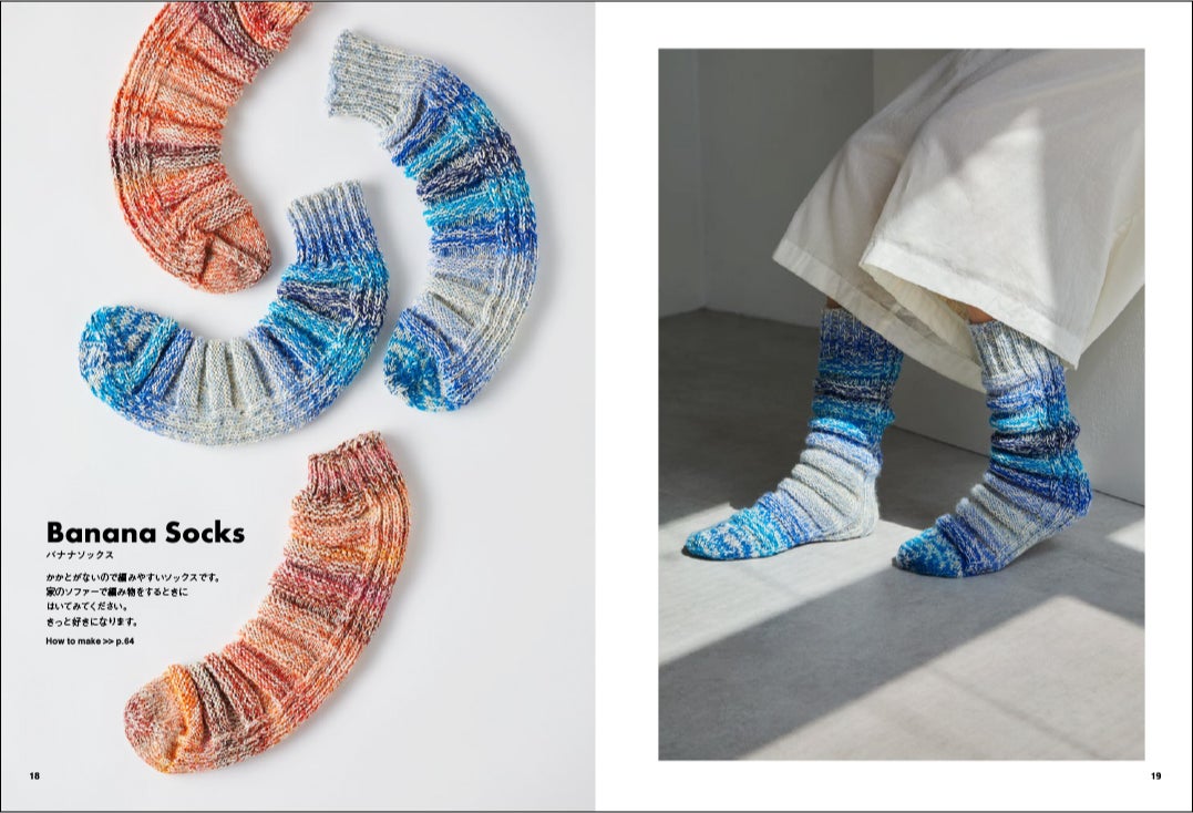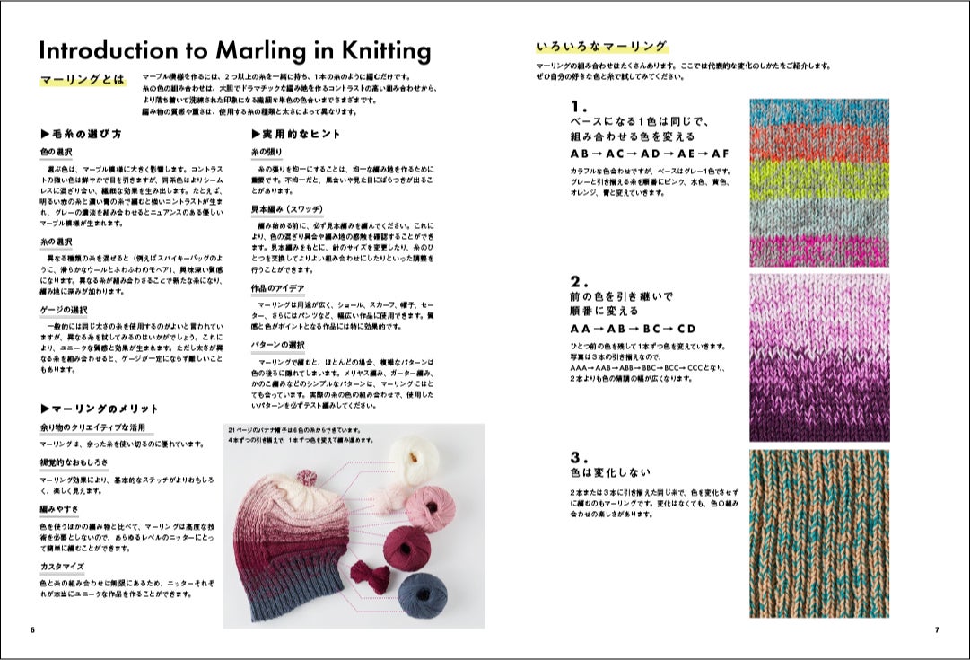 マーリングとは、いろいろなマーリング、マーリングのグラデーション、色について、色以外での見え方の違い、編み地の見え方、糸、道具/Banana Socks、Banana Hat、Banana Shawl、Spiky Bag、Stripy Snood、Pelerine、Onigiri Snood、Frill Shawl、Hanabira Scarf、All in One、Lacy Rib Pncho、Top Down Sweater、Sweat Pants /マーリングのアイデア、マーリングの基本、針の号数の出し方、伸縮性のある作り目、プリズムショールの編み始め、ジグザグショールの編み始め、ポンポンの作り方、基本の編み方、作品の編み方と作り方