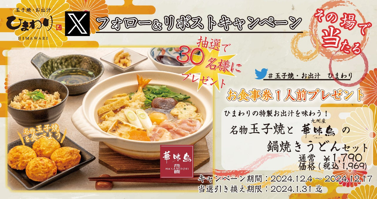 あわせて、その場で30名様に「『名物玉子焼と華味鳥の鍋焼きうどんセット1人前』デジタルお食事券(税込み1,969円相当)」が当たるXキャンペーンを開催中です。今回の「デジタルお食事券」をはじめ、デジタル技術を活用したブランド体験のデジタル化取り組み(DX)を進めております。「玉子焼・お出汁ひまわり」は、お客様の暮らしを彩り、普段の生活の中で小さな幸せを感じていただけるよう取り組んでまいります。