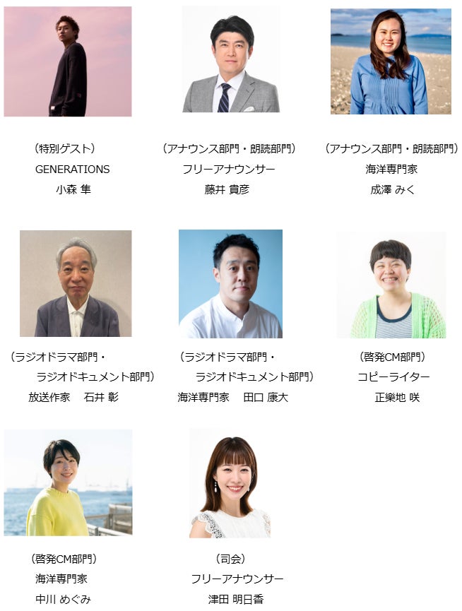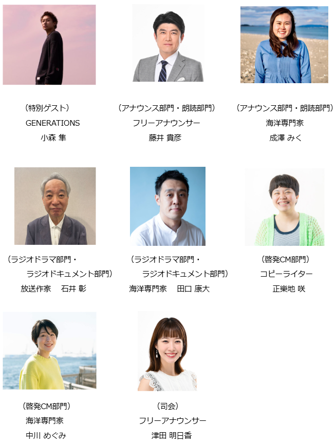 特別ゲストの小森隼さんに加え、審査員にはフリーアナウンサーの藤井貴彦氏、放送作家の石井彰氏、コピーライターの正樂地咲氏、さらに海洋分野の専門家が名を連ねます。