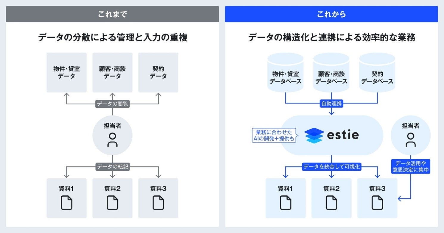 また、必要なデータを整理・蓄積することにより分析可能な環境を構築し、estieが保持する独自のAIの技術を活用しながら幅広いオフィスリーシング業務の自動化・高度化を目指します。