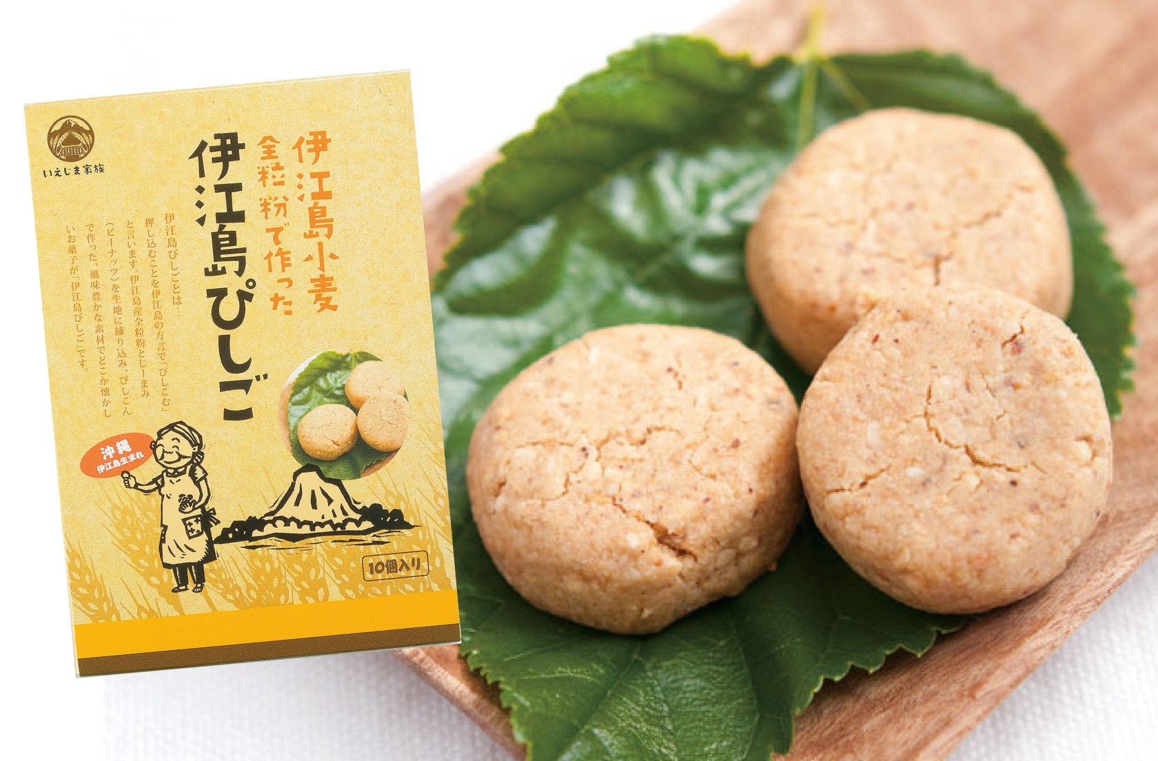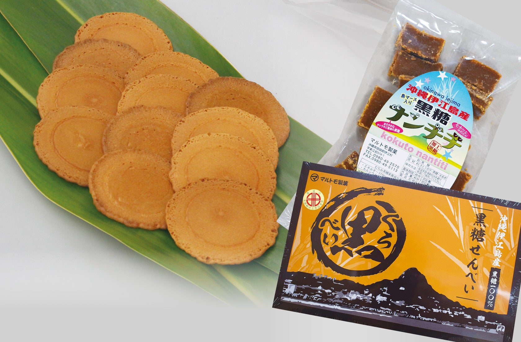 伊江島ぴしこ、小麦粉江島神力、黒糖せんべい黒べい、黒糖ナンチチなど伊江島特産のアイテムがずらり。