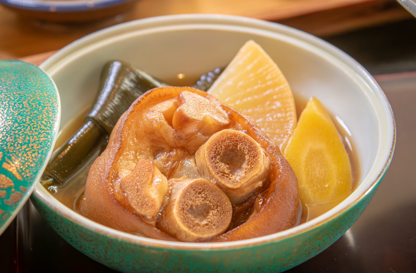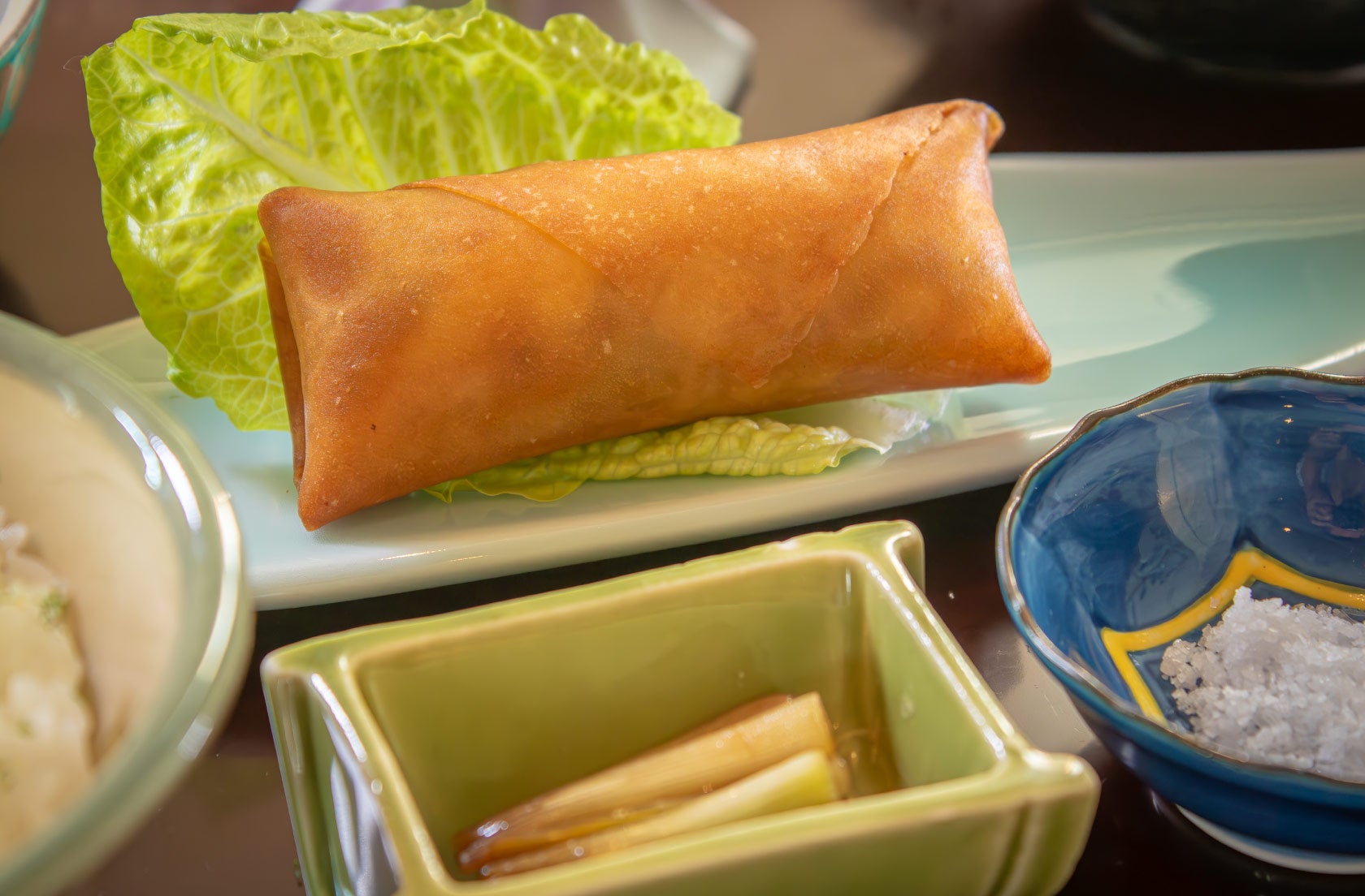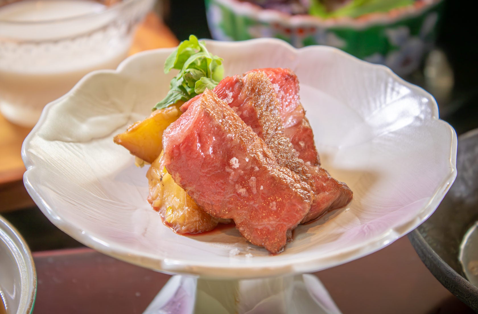 【御膳(主菜)】またよしカマボコと冬瓜のチーズ蒸し / チマグーの煮つけ / 伊江島産島ラッキョウとゆかり卵の春巻き / 緋桜牛の煎り焼き沖縄県産ジャガイモ添え / 伊江島産アーサのお汁 / 伊江島産海苔掛け御飯 / 伊江島産島ラッキョウの中華風漬物