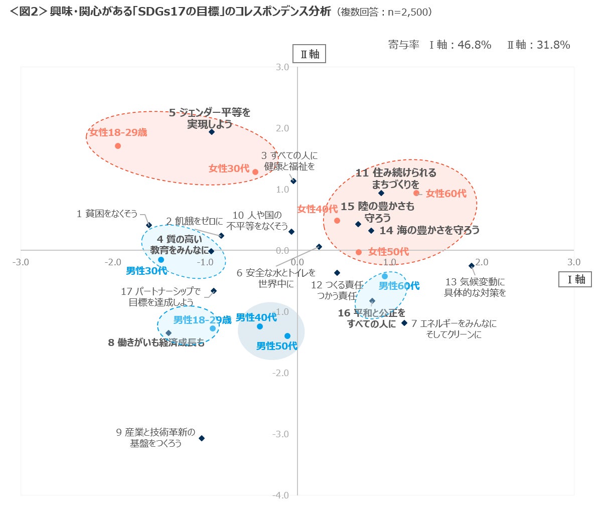SDGsの17の目標のうち”興味・関心がある”ものについて、コレスポンデンス分析(Correspondence Analysis)を用いて解析をした。女性18~29歳、30代は「5.ジェンダー平等を実現しよう」、女性40代、50代、60代は「11.住み続けられるまちづくりを」「14.海の豊かさを守ろう」「15.陸の豊かさも守ろう」、男性60代は「16.平和と公正をすべての人に」、男性30代は「4.質の高い教育をみんなに」、男性18-29歳は「働きがいも経済成長も」に興味・関心を持っている傾向がみられた。男性40代、50代は、17項目いずれも遠い位置にあり、興味・関心のなさが目立つ結果であった。<図2>