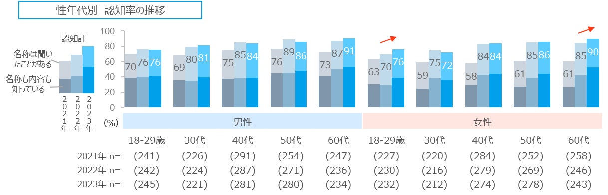 SDGsの認知率(”名称も内容も知っている”+”名称は聞いたことがある”)は83%と2022年とほぼ同様な結果であり、鈍化している。2022年より認知率がやや高まったのは、女性18~29歳と女性60代であった。<図1>
