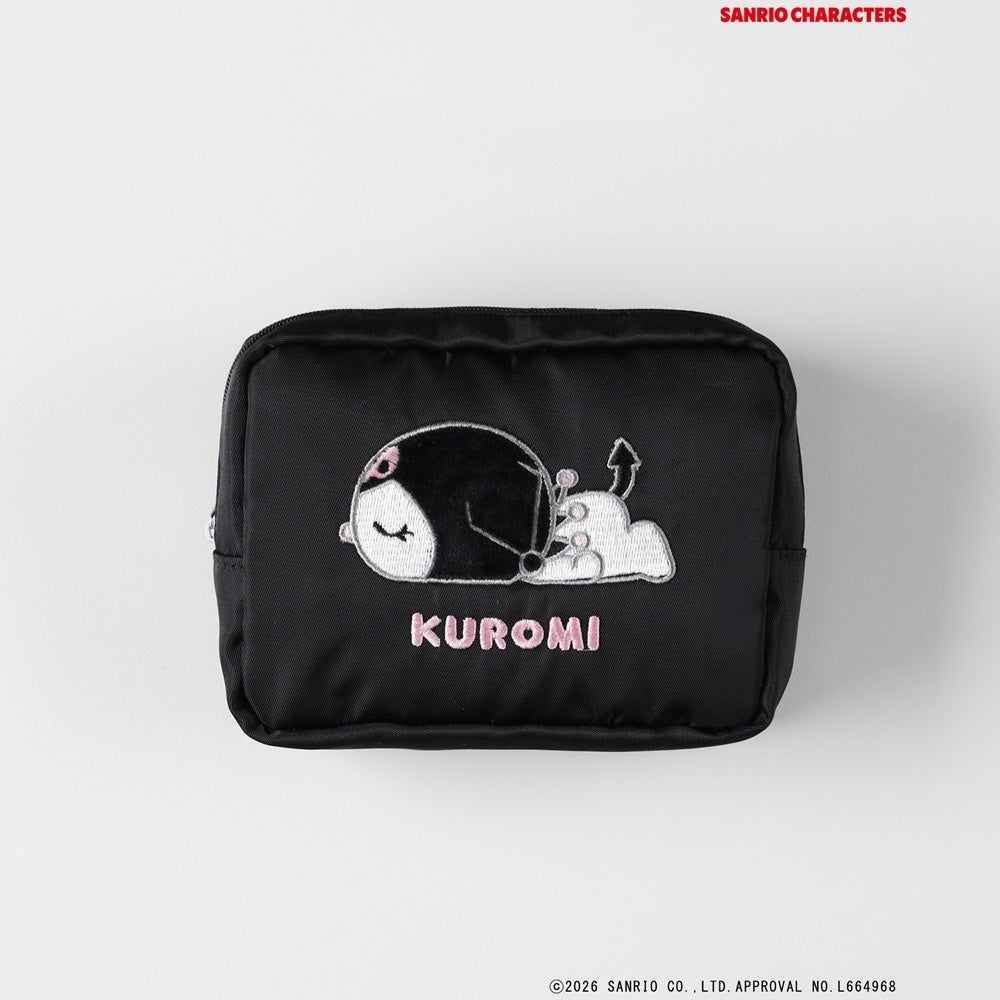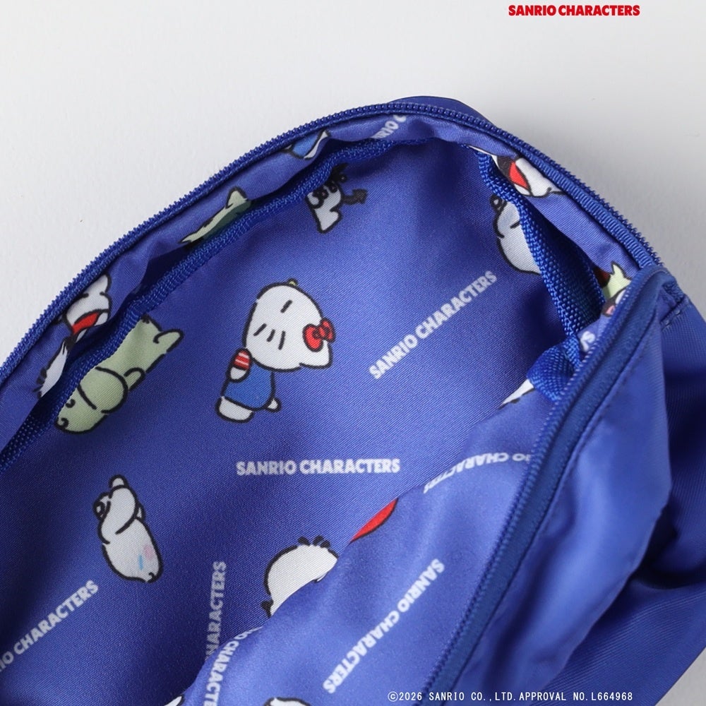 マチをたっぷりとったスクエア型でコスメはもちろん、モバイルバッテリーや充電ケーブルなどの整理にも最適なサイズです。ファスナーを開くと、総柄のキャラクターが施されており、細部までこだわりました。