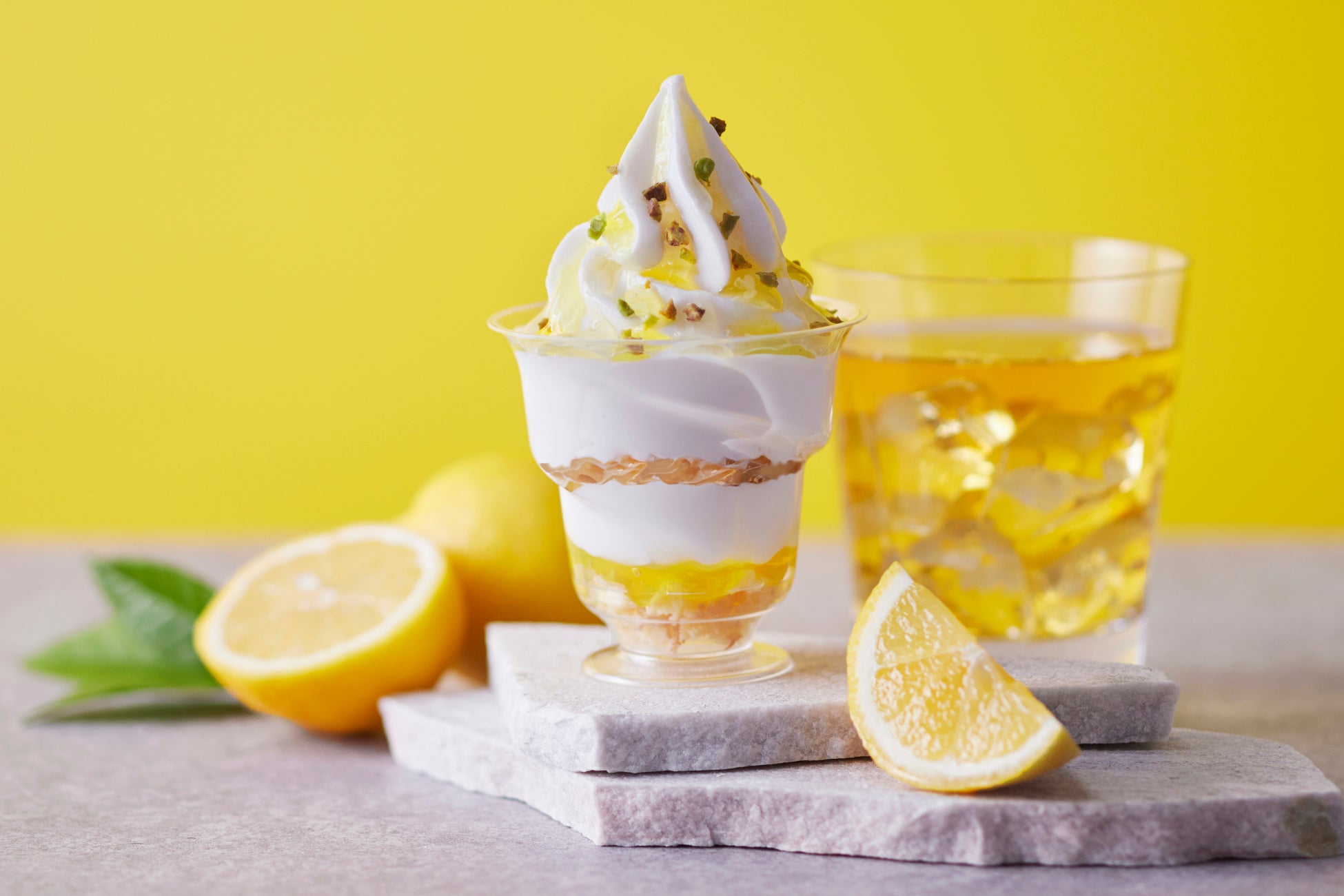 ミルキーなソフトクリームに、濃厚で深みのある味わいが特徴の福岡県志賀島産はちみつと、甘酸っぱいレモンソースをトッピング。さらにピスタチオをちりばめ、レモンのイエローとピスタチオのグリーンの爽やかなコントラストが映える、夏らしさたっぷりのサンデーに仕上げました。食べ進めると、ソフトクリームに忍ばせたサクサクのバタークッキーと甘酸っぱいレモンソースが顔を出す、食べ応えのある一品です。