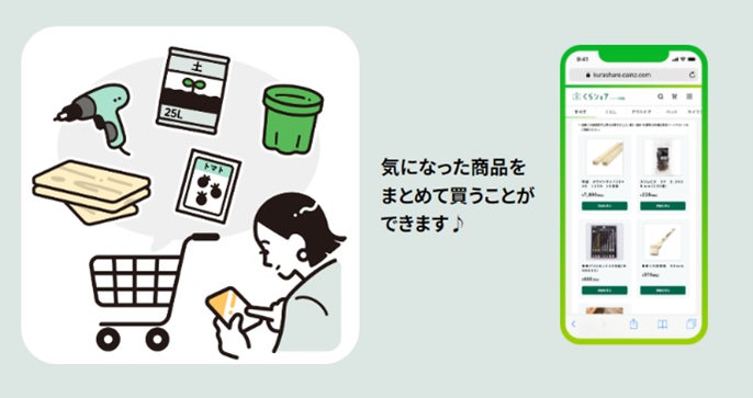 サービスの開始当初は、カインズのメンバー(従業員)が生活者としてひらめいた、くらしをもっと楽しく、もっと豊かにするアイデアとそれを実現するために必要な商品情報をくらシェアに投稿します。カインズのオンラインショップと連動しているので、気になった商品はスムーズに購入することができます。