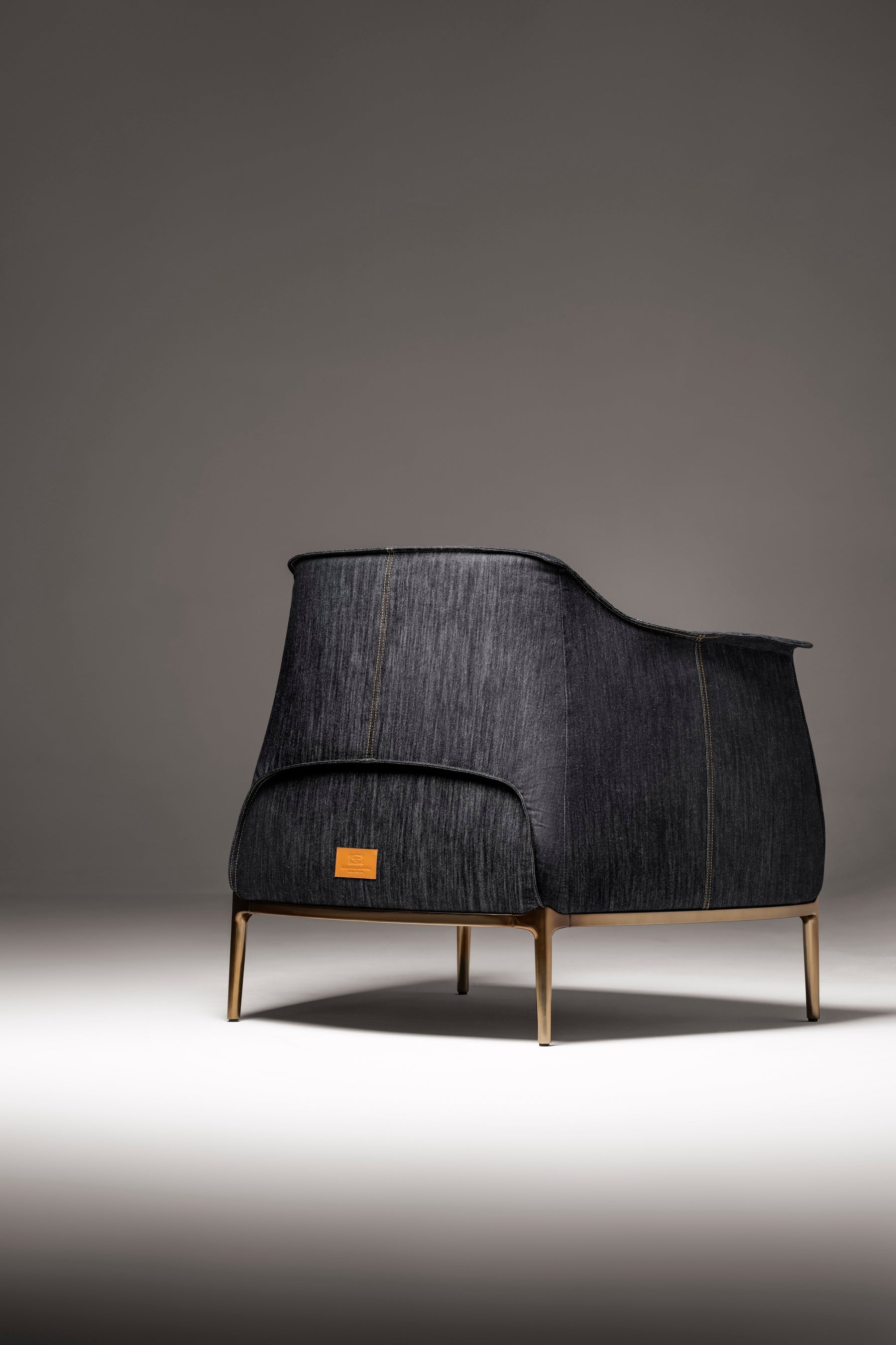「Archibald Denim Edition」は、オリジナルモデルの魅力である包み込むようなフォルムはそのままに、有機コットンのジャカードファブリックを使用しています。デニム特有のツイル織りや、耐久性を高めるウォッシュ加工により、深みのある素材感と上質な風合いを実現しました。ジーンズを思わせるイエローのダブルステッチ、金属パーツを連想させるアンティークブロンズ仕上げのベースなど、細部にまでこだわっています。使用されているファブリック「Everdenim(エバーデニム)」は、有機コットンを用いたGOTS(Global Organic Textile Standard)認証素材です。ソファやアームチェアに適した高い耐久性を備え、ストーンウォッシュ仕上げにより、デニムらしい奥行きのある質感が生まれています。背面にはキャメルカラーのサドルレザーラベルを配置し、ロゴの刻印と“Archibald Denim Edition. Unique, like you.”の刺繍を施しました。デニムのバックパッチを想起させるディテールで、唯一無二の個性をさりげなく表現しています。