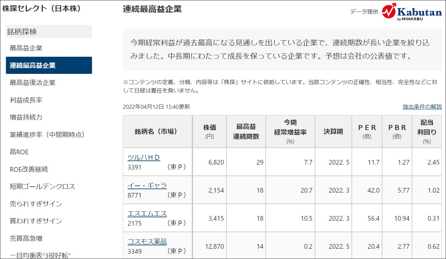 また、日本経済新聞社が出資するミンカブ・ジ・インフォノイド社(証券コード 4436)の運営する株式情報サイト「Kabutan(株探)」と連携し、投資の参考になると思われるデータを拡充しました。国内の最高益企業の一覧や業績見通しに対する進捗率上位企業、チャート分析上注意サインがともった銘柄群などを追加したほか、国内株式市場や米国株式市場で注目を集めているテーマの人気ランキングがチェックできるようになりました。