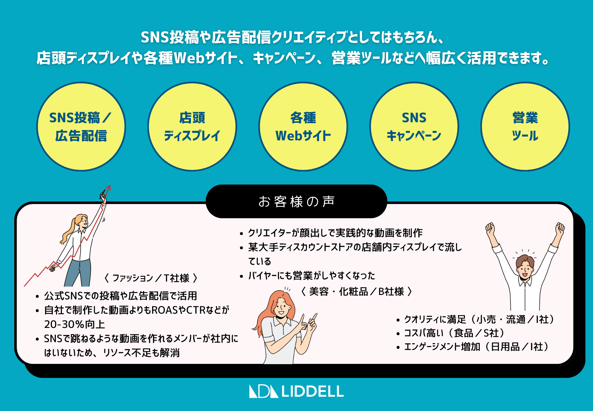 InstagramやTikTokでの投稿や、Instagram、TikTokほかYouTubeショート、X、アドネットワークなどの広告配信のほか、Webサイト、店頭ディスプレイや営業・商談ツールでの活用も可能です。「自社で制作した動画よりもROASやCTRなどが20〜30%向上した」「クリエイターに顔出しで実践的な動画を制作してもらえる」「バイヤー商談がスムーズになった」など、ご活用いただいている多種多様な企業より、好評をいただいております。