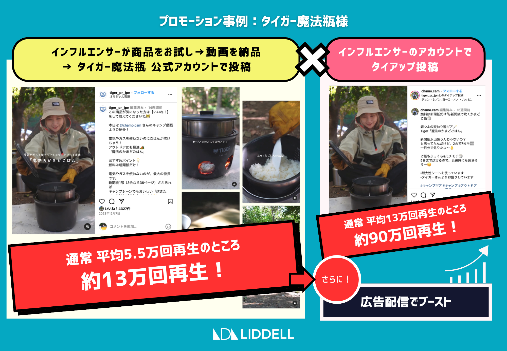 キャンパーとして活動するインフルエンサー chamo(https://www.instagram.com/reel/Cz08FLYPnsP/)が動画制作。アウトドアシーンで『魔法のかまどごはん』を用いて炊飯し実食までをショート動画にまとめ、電気やガスを使わずにごはんを炊くことができる手軽さとごはんのおいしさを訴求。納品した動画をタイガー魔法瓶 公式アカウントで投稿したところ、他動画の数倍の高エンゲージメントを獲得しました。さらに、コンバージョン獲得を目的に広告配信したところ、静止画や静止画カルーセルよりもリール動画が圧倒的に高パフォーマンスで推移しました。あわせて、インフルエンサーのアカウントでもタイアップ投稿。通常 平均13万回再生のところ、 約90万回再生の人気動画となりました。