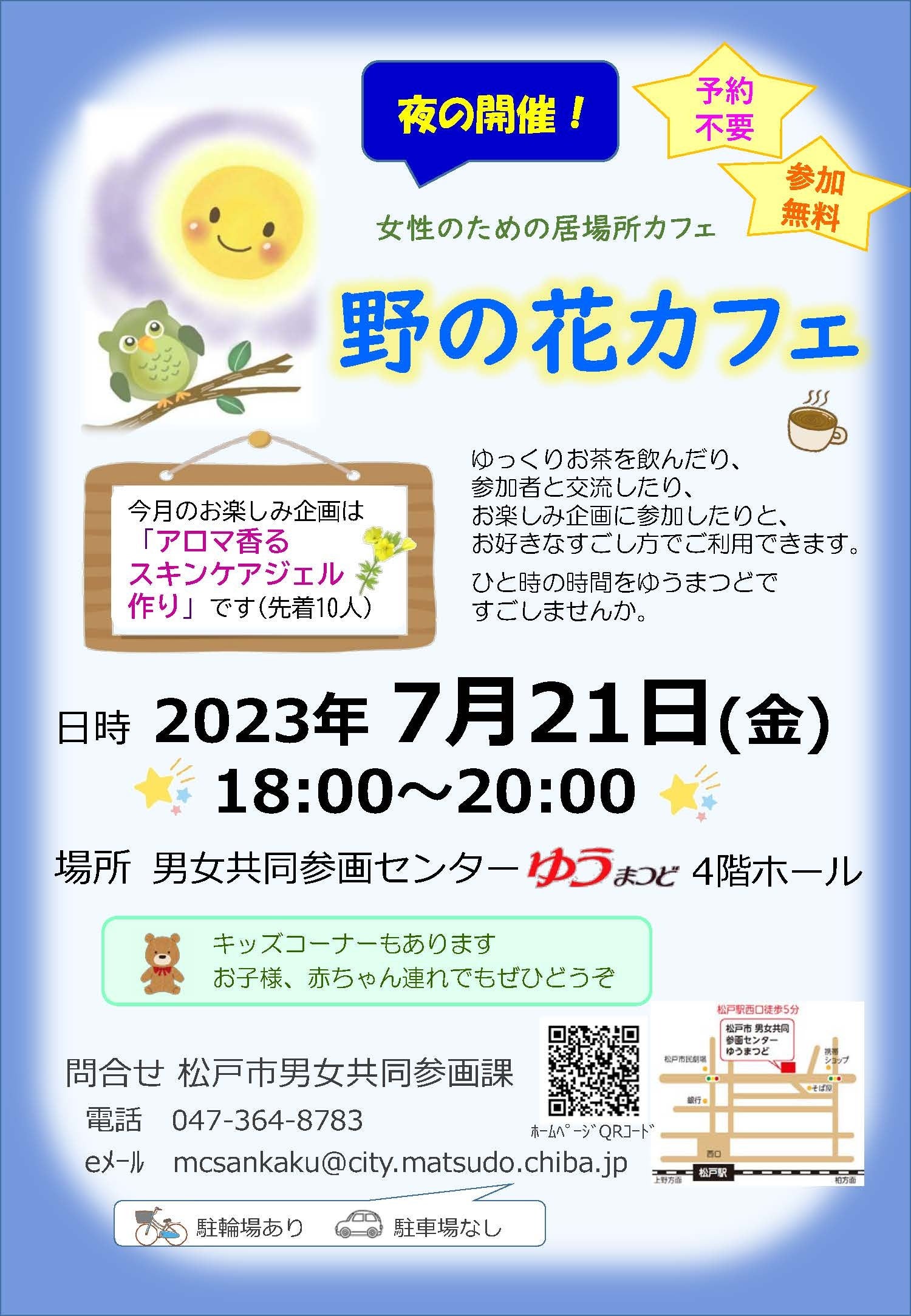 今年度から男女共同参画センター「ゆうまつど」で開始した女性のための居場所「野の花カフェ」を、7月は夜に開催します。