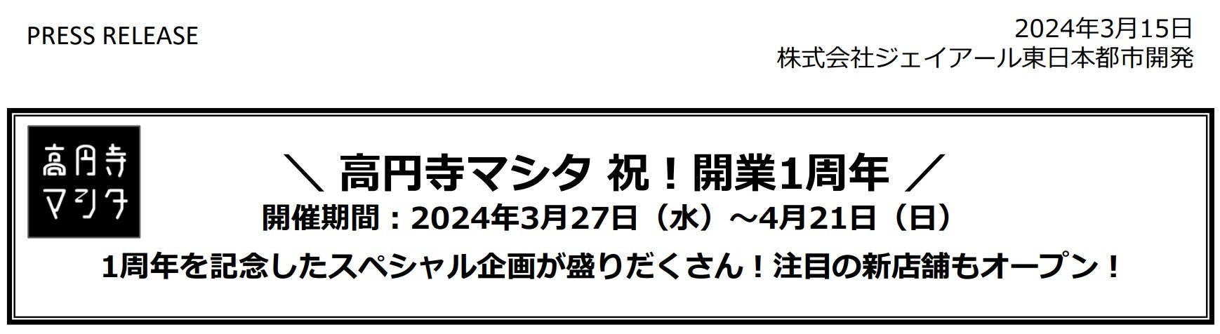 「高円寺マシタ」は2024年3月31日㈰に開業1周年を迎えるにあたり、2024年3月27日㈬~2024年4月21日㈰の期間、開業1周年を記念して、多数のアーティストが出演するライブステージやスタンプラリーなど、様々なイベントを開催します。特別な1周年記念イベントにぜひご参加ください!