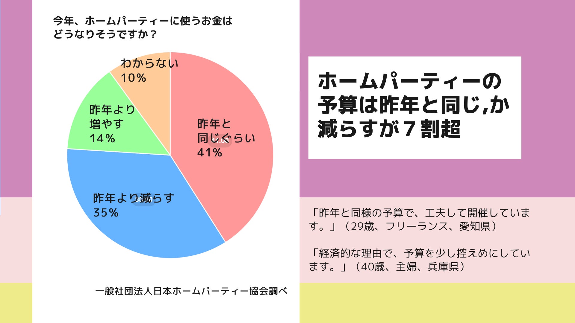 アンケートの結果、昨年と同様の予算でホームパーティーを開催すると回答した人は、全体の約41%を占め、「昨年と同じ予算で工夫して開催しています。」(29歳、フリーランス、愛知県)など限られた予算内で創意工夫を凝らしてホームパーティーを楽しんでいる様子が伺えます。