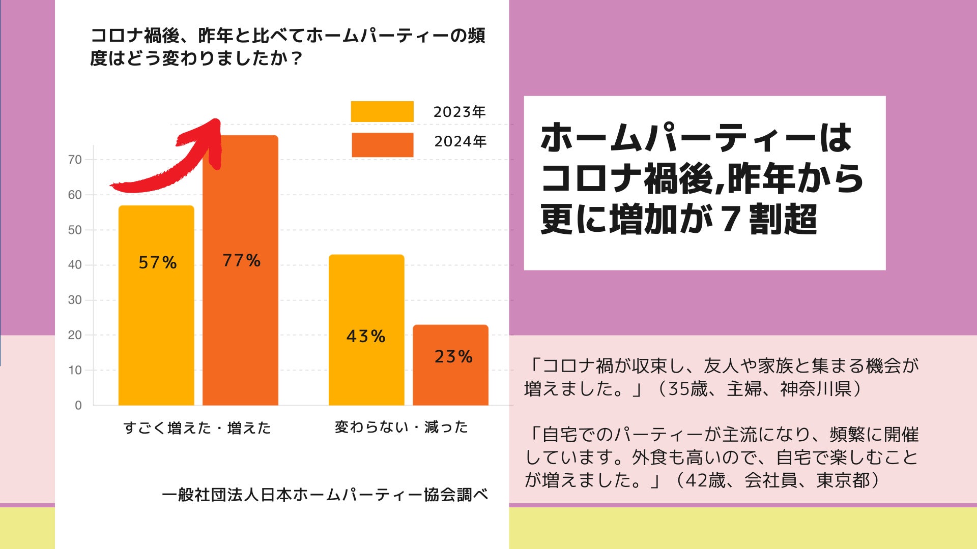 この調査結果は、コロナ禍を経てホームパーティーの開催頻度が更に増加していることを明確に示しています。不安定な社会状況の中、人々は家庭内での安心できる時間を求め、身近な人々と過ごすことの重要性が一層高まっていると考えられます。