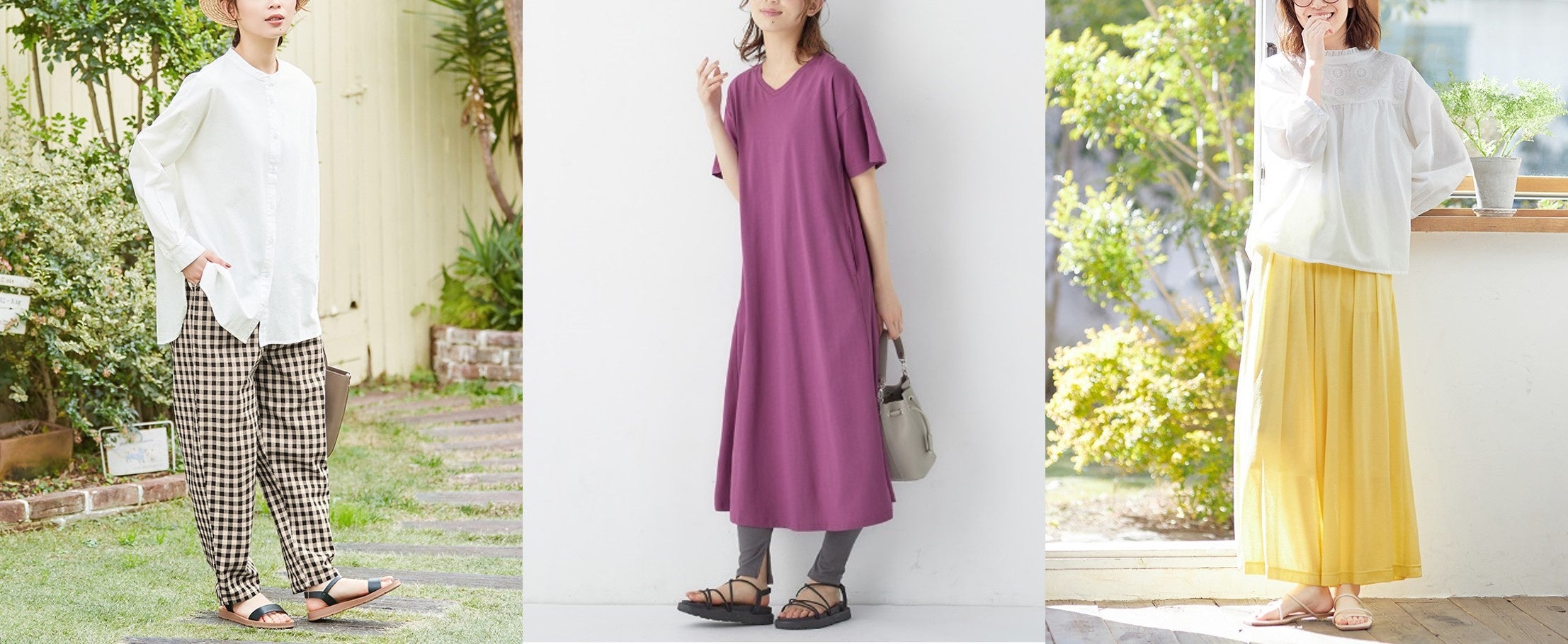 今季は、取り入れるだけで気分が上がるカラーアイテムが勢揃い。さらに選べる豊富なサイズ展開のほか、UVカットや接触冷感、吸汗速乾の機能性により、ストレスなく夏のおしゃれを楽しめる商品ラインナップです。リラックス感のあるシルエットや肌に馴染む心地よさなど、日々の”小さな幸せ“を感じさせてくれる「Viola e Viola」のアイテムで、1着でサマになる夏の最旬コーディネートを提案します。