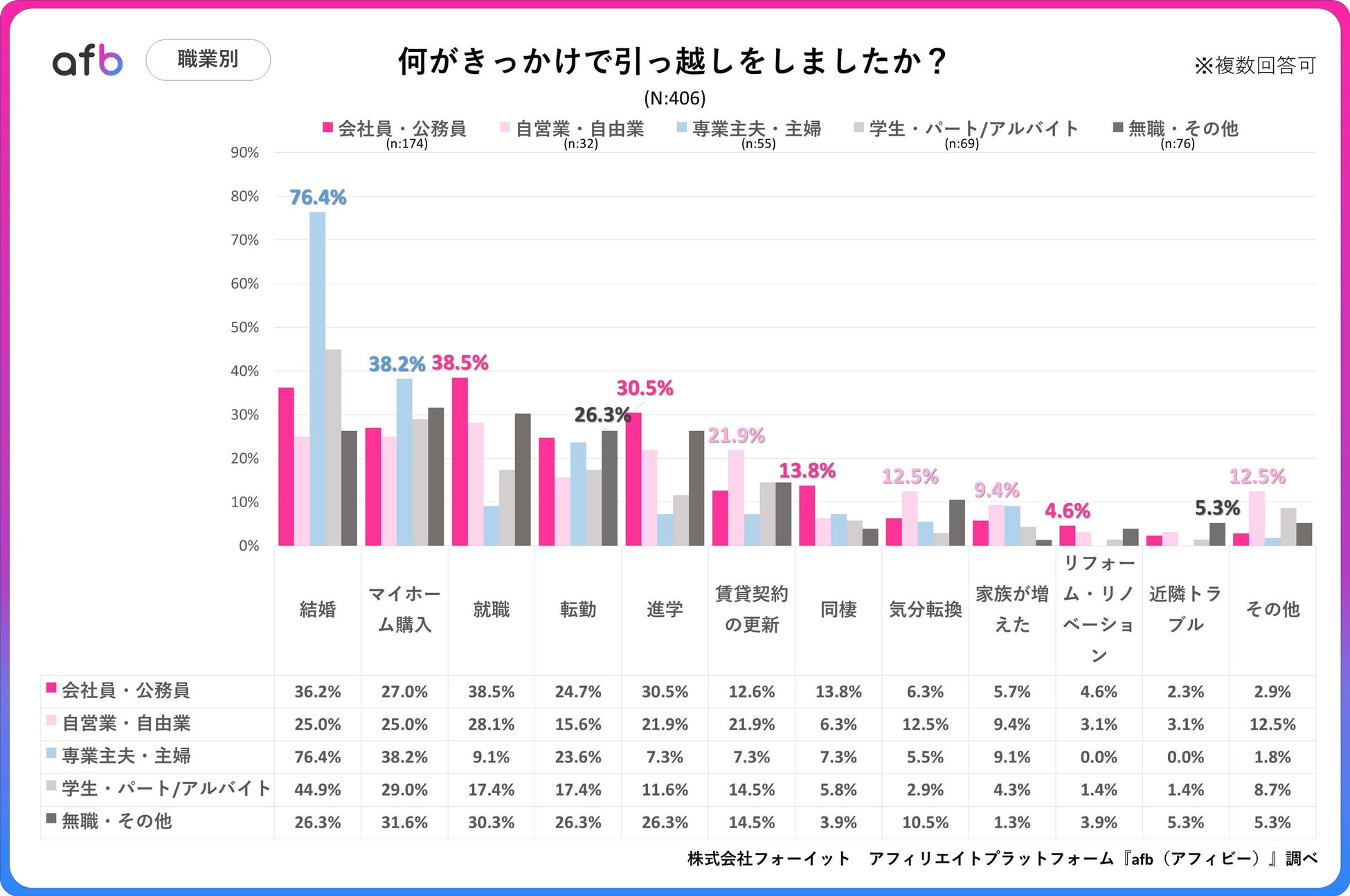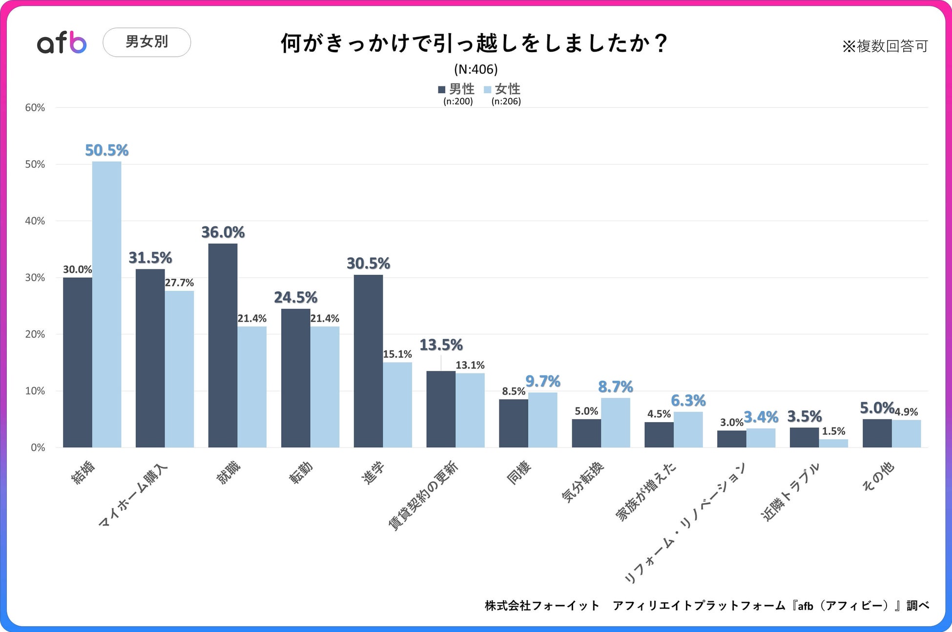 男女別で見ると、男性では「就職」や「進学」がきっかけでの引っ越しが多く、女性では「結婚」をきっかけとしたものが多くなりました。