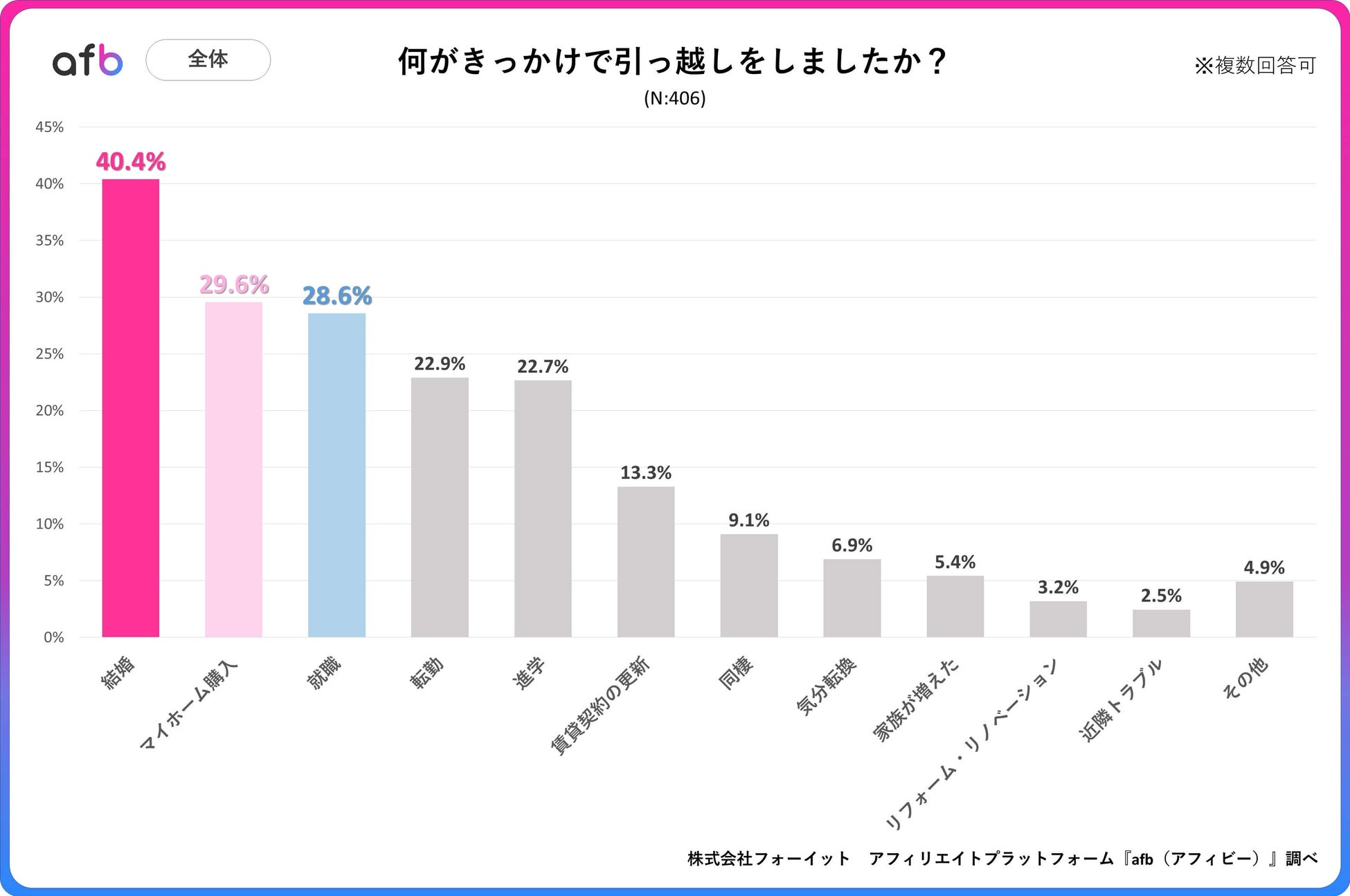 事前調査で「引っ越しをしたことがある」と回答した20歳〜69歳の男女を対象に、「何がきっかけで引っ越しをしましたか?」というアンケートを実施したところ、最も多かった回答は「結婚」で40.4%でした。次いで、「マイホーム購入」が29.6%、「就職」が28.6%で続くという結果になりました。