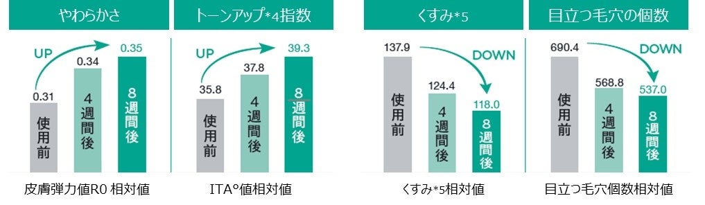 【調査概要】〔試験方法〕半顔側はLEDオン、反対側はLEDオフの製品をBRIGHTモードで1週間あたり6回各10分使用。使用前、4週間後、8週間後の肌を計測。〔被験者〕40代~50代の女性15名