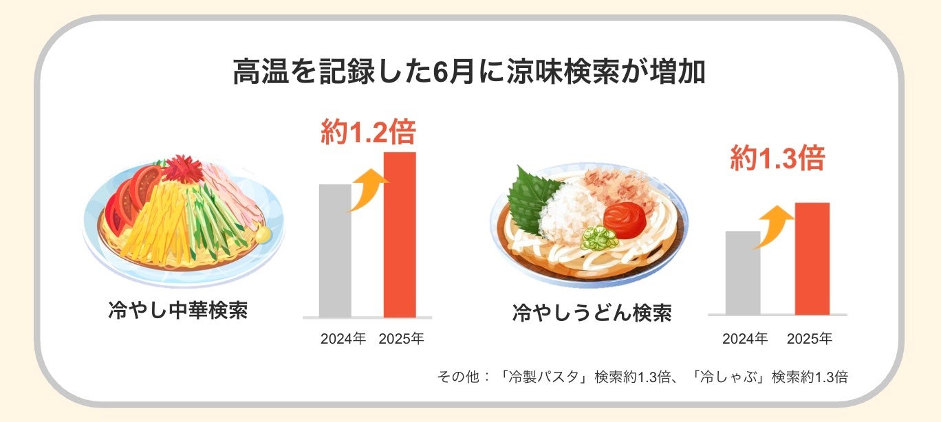 昨年6月の異例の高温を受け、「冷やし中華」(前年比約1.2倍)や「冷やしうどん」(前年比約1.3倍)などの検索頻度(※)が例年より一足早く活発化しました。夏本番を待たず、自炊時のレシピを切り替える動きが加速しています。