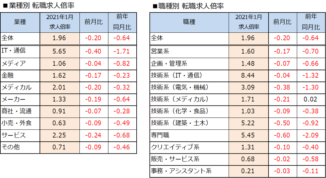 転職サービス「doda(デューダ)」2021年1月 転職求人倍率 1.96倍(前月比-0.20ポイント)~求人数は増加傾向も、例年どおり4月入社希望の転職希望者の増加により求人倍率は低下~