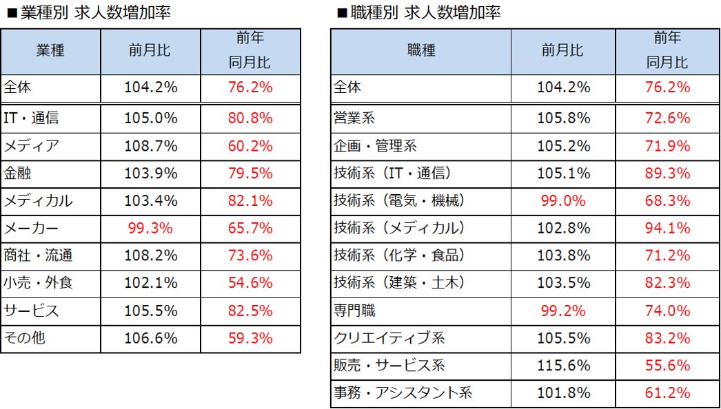 業種別では、「その他」を除く8業種のうち「メーカー」以外の7業種で前月より求人数が増加しました。求人の増加率が最も高かったのは、「メディア」(前月比108.7%)、次いで「商社・流通」(前月比108.2%)でした。職種別では、11職種のうち「技術系(電気・機械)」「専門職」を除く9職種で前月より求人数が増加しました。求人の増加率は、高い順に「販売・サービス系」(前月比115.6%)、「営業系」(前月比105.8%)となりました。