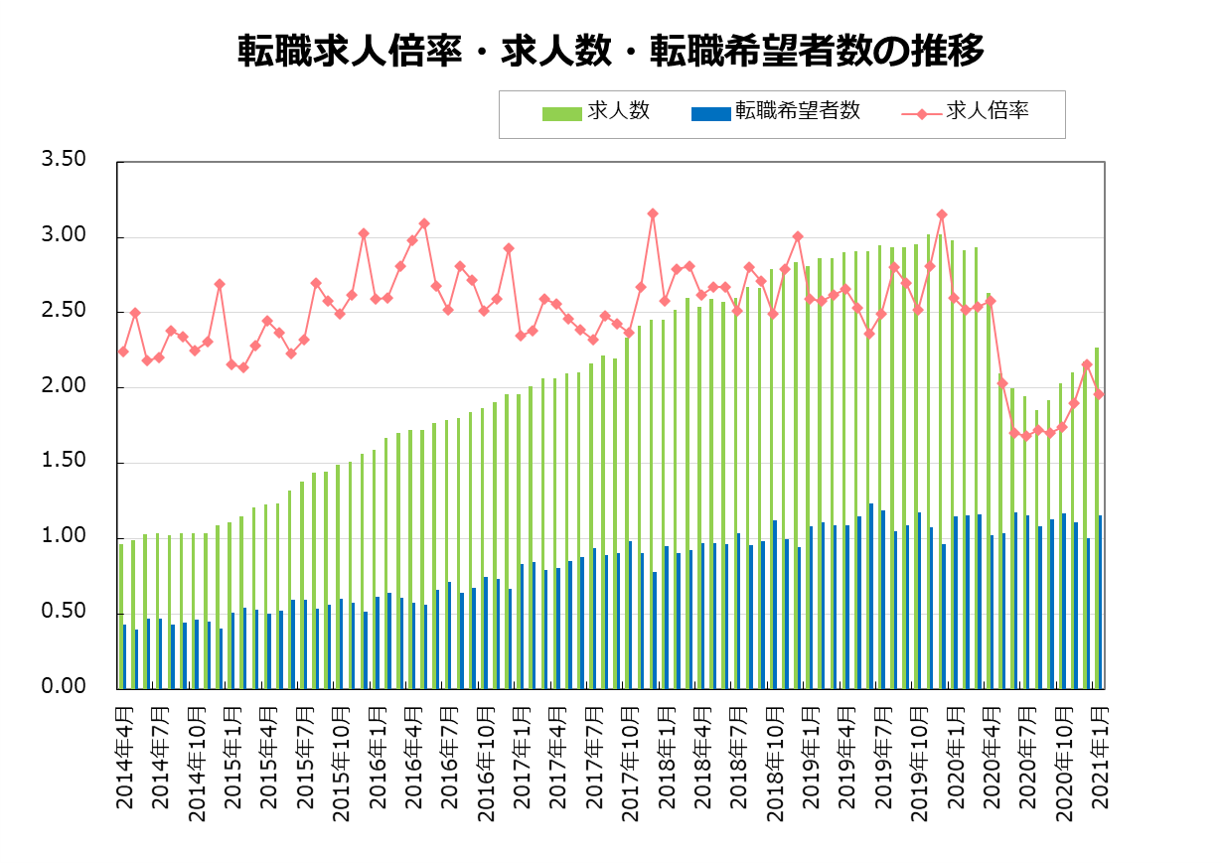 2021年1月の転職求人倍率は、前月比-0.20ポイントの1.96倍となりました。求人数は前月比104.2%、前年同月比76.2%となりました。転職希望者数は前月比115.0%、前年同月比100.8%でした。