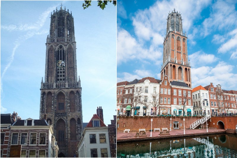 画像:オランダのドム塔(左)とハウステンボスのドムトールン(右)