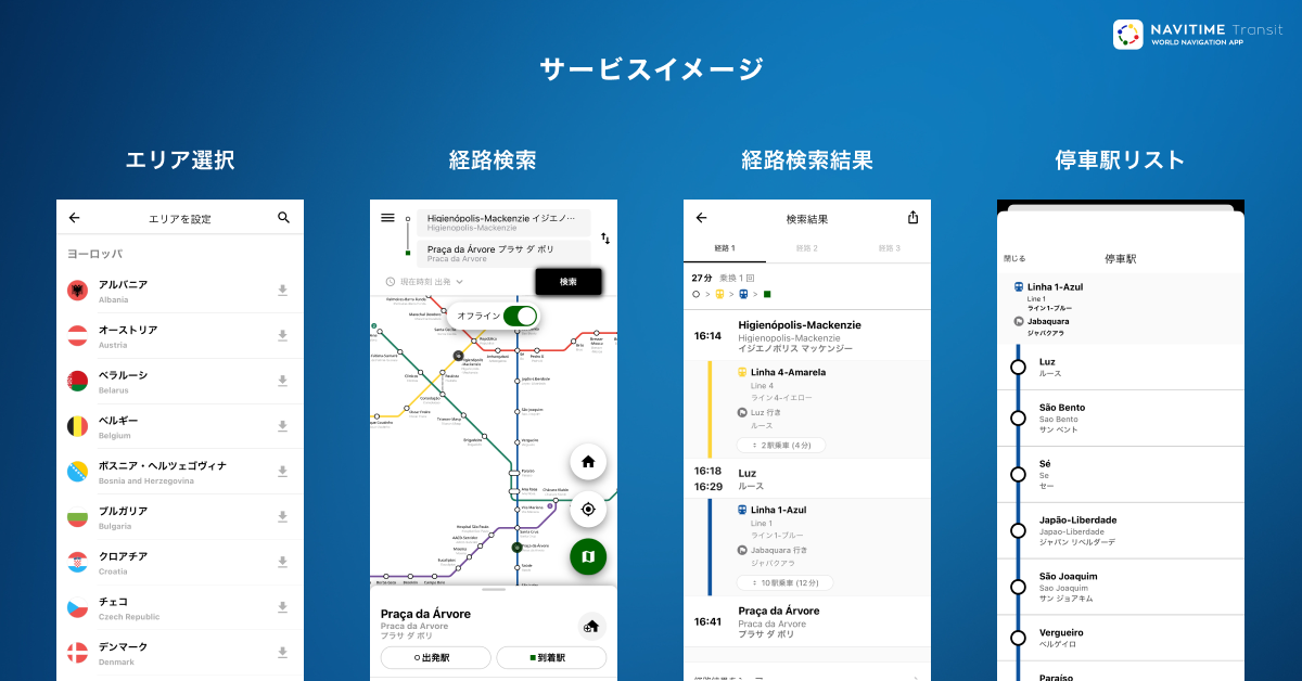 『NAVITIME Transit』は、2013年11月よりサービスを開始しており、世界の鉄道・バス・フェリーなど公共交通機関の乗換検索※2をオフライン※3で利用できる、乗換案内サービスです。エリアごとにナビタイムジャパンが独自に作成する路線図から駅を直接タップするだけで乗換検索でき、初めて利用する方でも直感的に操作できるのが特徴です。北アメリカ、南アメリカ、アジア、オセアニア、ヨーロッパ、アフリカといった世界92の国・エリアに対応し、日本語のほか、英語、中国語(繁体字・簡体字)など計18言語で提供しています。日本人の海外旅行や海外出張をはじめ、現地の方の日常的な利用や海外の方の海外旅行でもお役立ていただけます。