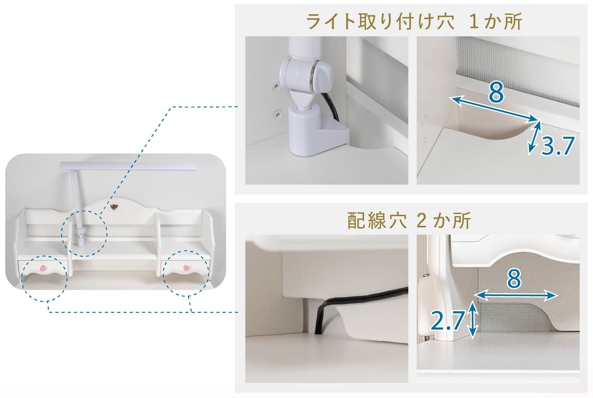 デスクの上棚には1か所のクランプ式ライト取付穴と2か所の配線穴があるので、乱雑になりがちな電源タップ等の配線を整理し、デスクをすっきり整頓できます。