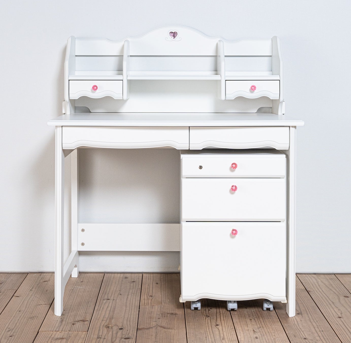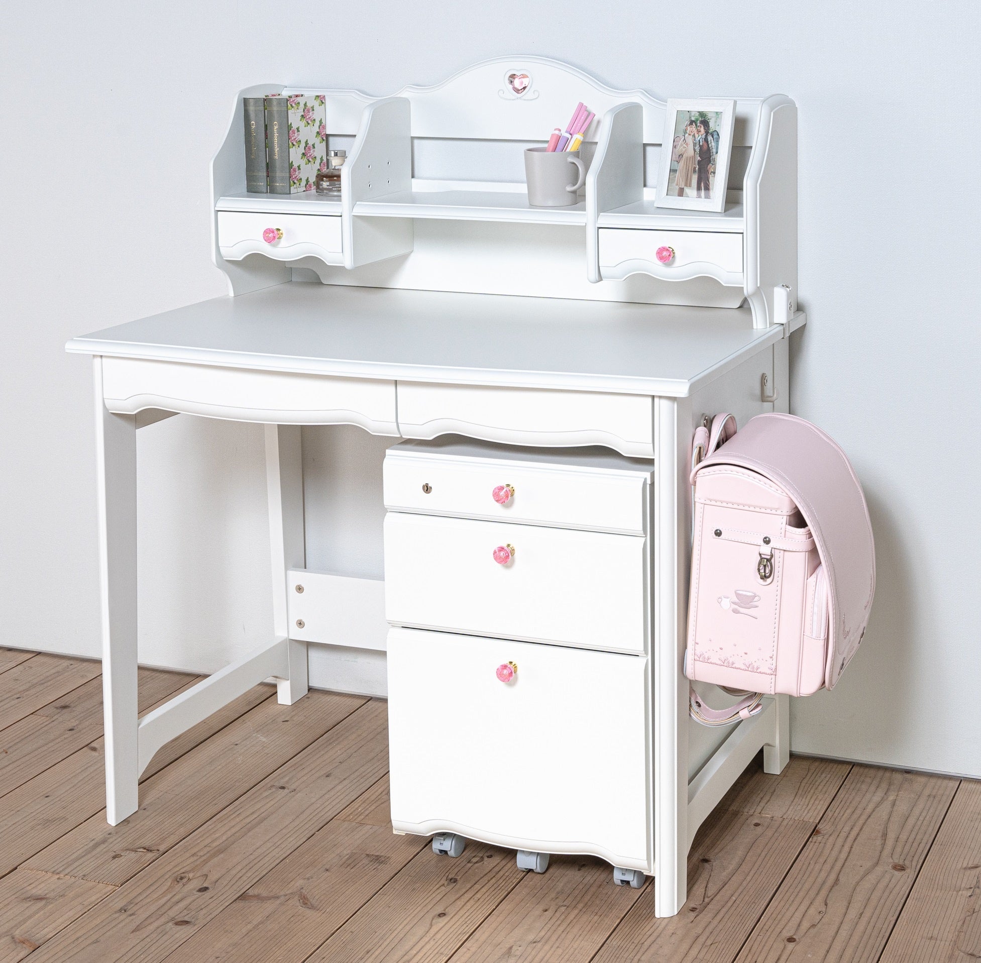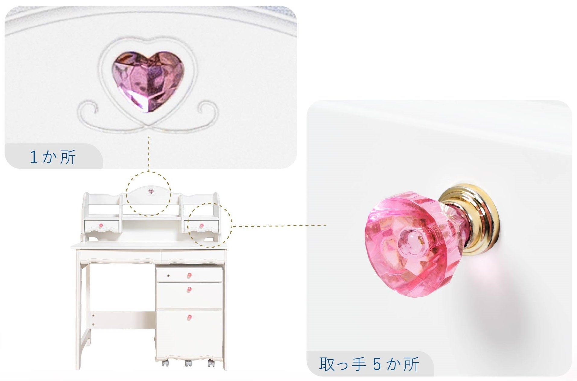 書棚の上部にはクリスタル調のハートが、ワゴンの引き出しにはクリスタル調の取っ手が付いており、デザインのアクセントになっています。