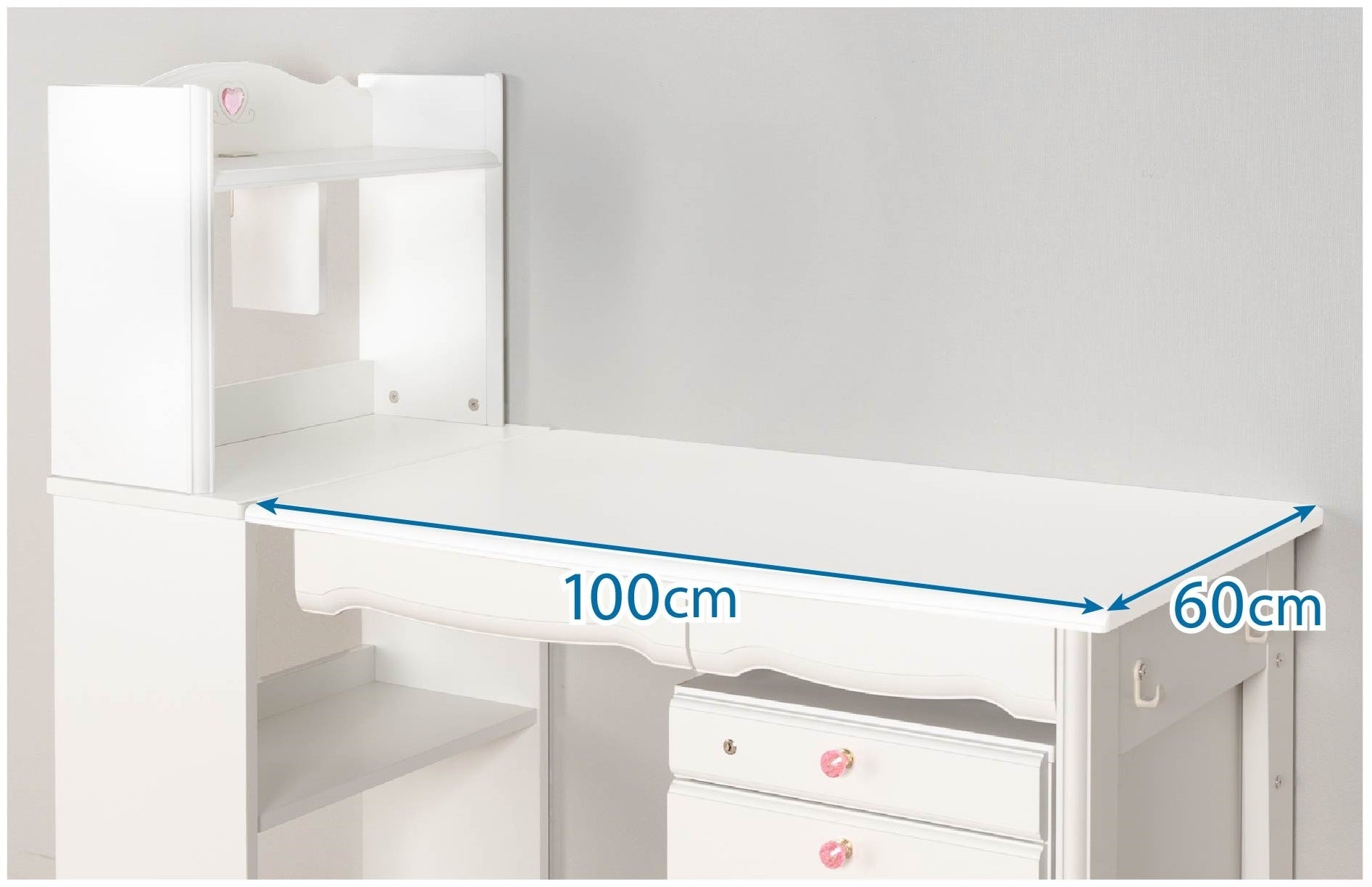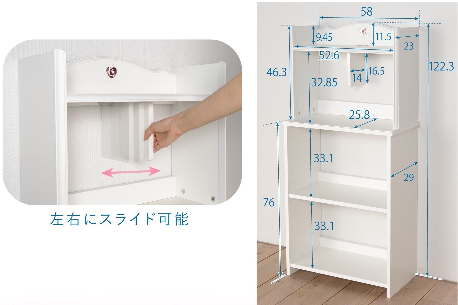 上棚の上部にはクリスタル調のハートが、上棚とワゴンの引き出しにはクリスタル調の取っ手が付いており、デザインのアクセントになっています。