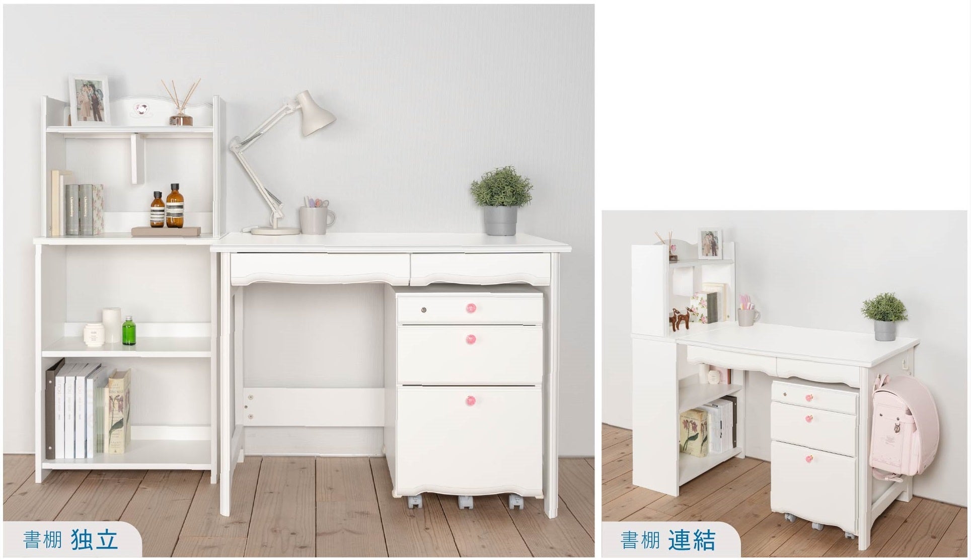 左からジュエルキュートベーシックデスク、ジュエルキュートユニットデスク